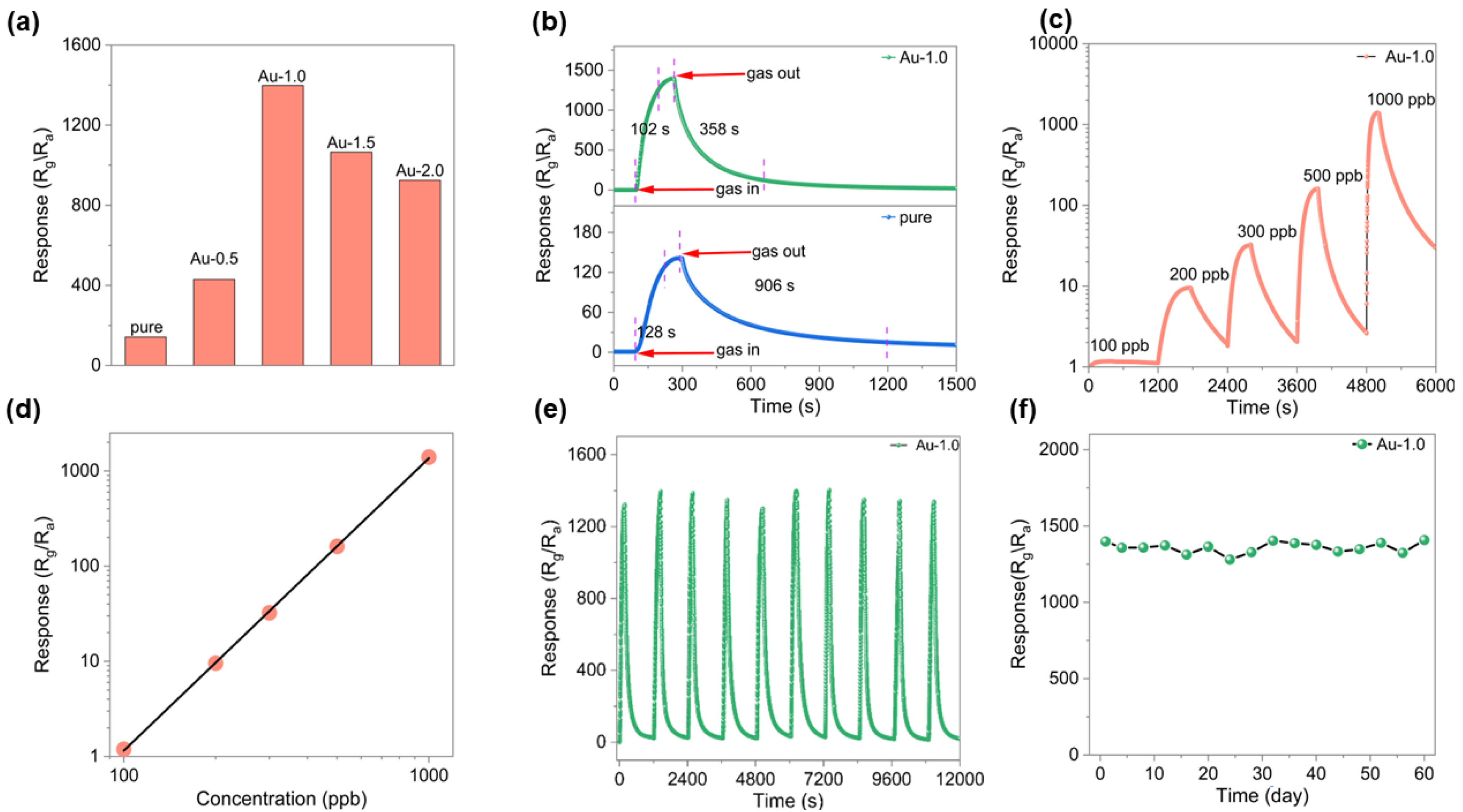 Figure 3. All tests were conducted at 30 °C. (a) Responses of sensors based on different samples toward 1 ppm O3 gas. (b) Response and recovery curves toward 1 ppm O3. (c) Dynamic responses of the Au-1.0 sensor to different O3 concentrations. (d) The linear relationship between the sensor response and different O3 concentrations. (e) Repeatability of the Au-1.0-based sensor toward O3. (f) Long term stability of the Au-1.0 sensor toward 1 ppm O3.