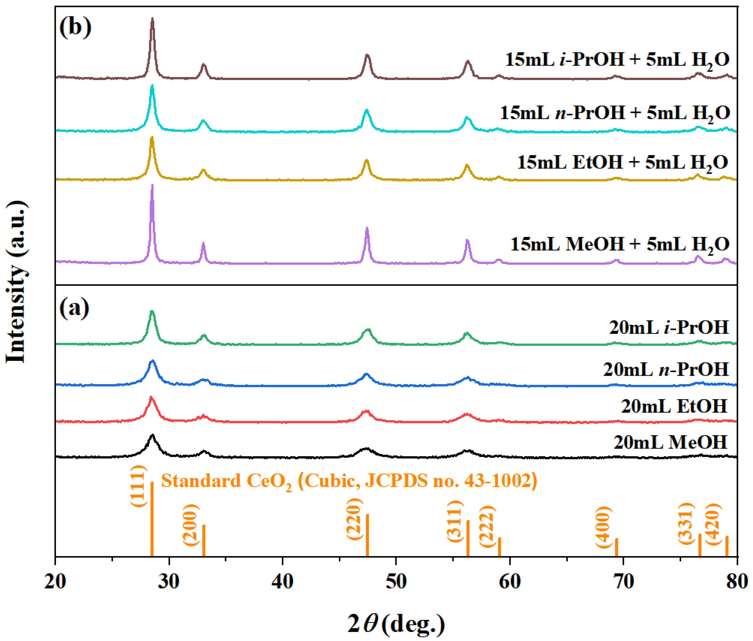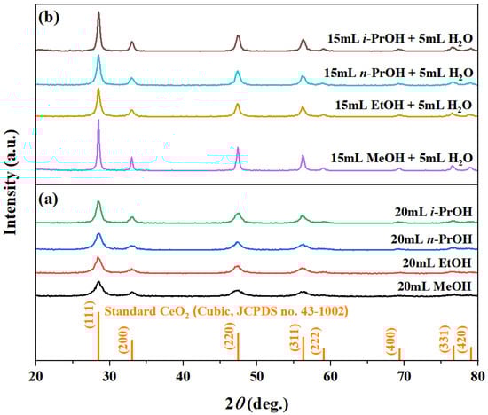 The XRD patterns in Figure 1 confirm the formation of pure-phase cubic CeO2 (JCPDS no. 43-1002) under all tested solvent conditions, whether using pure alcohols (20 mL of MeOH, EtOH, n-PrOH, or i-PrOH) or binary alcohol/H2O mixtures (15 mL alcohol + 5 mL H2O). The primary (111), (200), (220), and (311) diffraction peaks are prominent in every pattern (Figure 1a,b). Notably, the introduction of H2O significantly enhanced the diffraction intensity compared to the pure alcohol systems, indicating improved crystallinity (Table 2). Among the binary systems, MeOH/H2O yielded the highest peak intensity, followed by i-PrOH/H2O, whereas EtOH/H2O and n-PrOH/H2O produced lower intensities (Figure 1b). Although a lower alcohol boiling point (MeOH: 64.7 °C < EtOH: 78.3 °C < i-PrOH: 82.6 °C < n-PrOH: 97.1 °C) typically favors higher autogenous pressure and crystallization, the observed intensity trend does not follow this sequence. This suggests that solvent polarity and specific synergies with H2O collectively govern crystallization kinetics and final crystallinity.