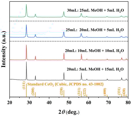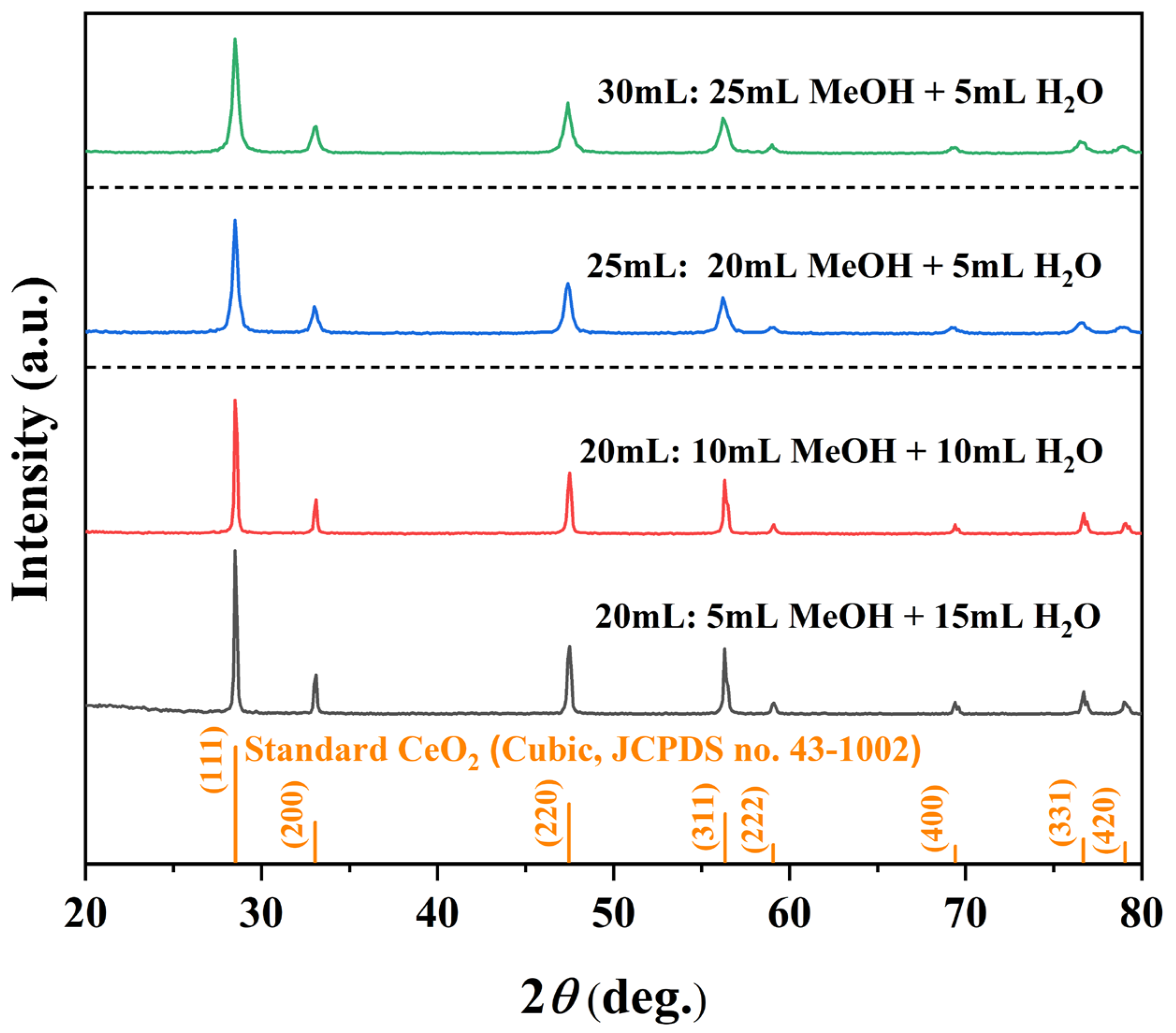 To elucidate how solvent composition governs CeO2 formation, we systematically varied the MeOH/H2O ratio following two experimental schemes. One maintained a fixed total solvent volume of 20 mL while varying the MeOH/H2O ratios at 5:15, 10:10, and 15:5 mL. Another kept the H2O volume constant at 5 mL and progressively increased the MeOH volume to 20 mL and 25 mL, corresponding to total volumes of 25 mL and 30 mL, respectively. All XRD patterns (Figure 3) confirm phase-pure cubic CeO2 (JCPDS no. 43-1002) without impurities. While variations in the MeOH/H2O ratio at a fixed 20 mL total volume caused only minor changes in peak intensity and width, increasing the total volume to 25 and 30 mL significantly reduced peak intensity and broadened the reflections (Table 3). This suggests that a higher solvent filling lowers the autogenous pressure and dilutes the precursor concentration, thereby impairing crystallinity and reducing crystallite size.