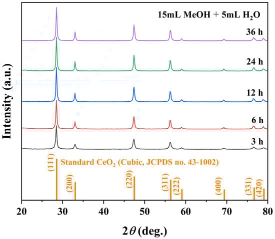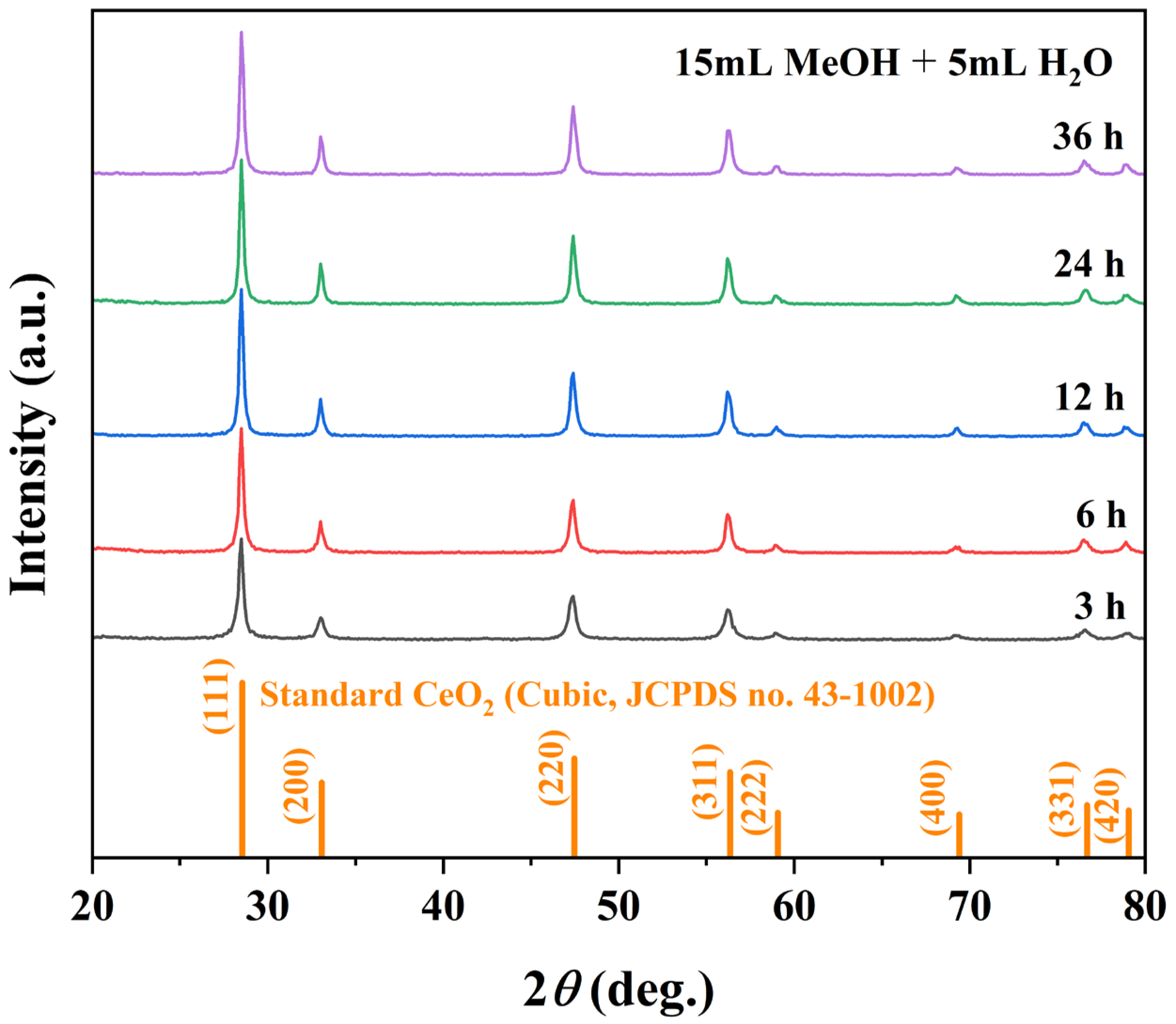 The crystallization pathway of octahedral CeO2 was investigated by varying the solvothermal time (1–36 h) while maintaining the optimal solvent composition (15 mL MeOH + 5 mL H2O) and temperature (180 °C). XRD patterns in Figure 5 display that all samples except the 1 h product exhibit the characteristic peaks of phase-pure cubic CeO2 (JCPDS no. 43-1002). The 1 h sample yielded insufficient material for reliable XRD, indicating early-stage nucleation. From 3 to 12 h, the diffraction peak intensified and sharpened, reflecting progressive crystallinity improvement and grain growth, with the highest crystallinity achieved at 12 h (Table 4). Peak profiles stabilized at 24 h, suggesting completion of primary crystallization. After 36 h, peaks broadening and a slight decrease in the (111) intensity indicate reduced crystallite size and the onset of surface dissolution or Ostwald ripening.