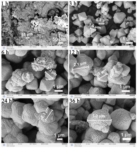 The corresponding morphological evolution, as revealed by SEM in Figure 6, further supports this crystallization pathway. At 1 h, only undefined plate-like structures were observed. By 3 h, a mixture of nano- and micro-sized octahedra appeared. At 12 h, well-faceted micro-octahedra predominated, consistent with the optimal crystallinity seen in XRD. Crystal size continued to increase until 24 h. After 36 h, surface pitting and cavities became evident, confirming partial dissolution and aligning with the XRD peak broadening. Collectively, the results delineate a clear time-dependent trajectory: nucleation and crystallization (1–12 h), crystal growth and maturation (12–24 h), and surface restructuring or partial dissolution under extended conditions (>24 h). This understanding provides crucial guidance for selecting the optimal reaction window to obtain CeO2 octahedra with high crystallinity and well-defined morphology.