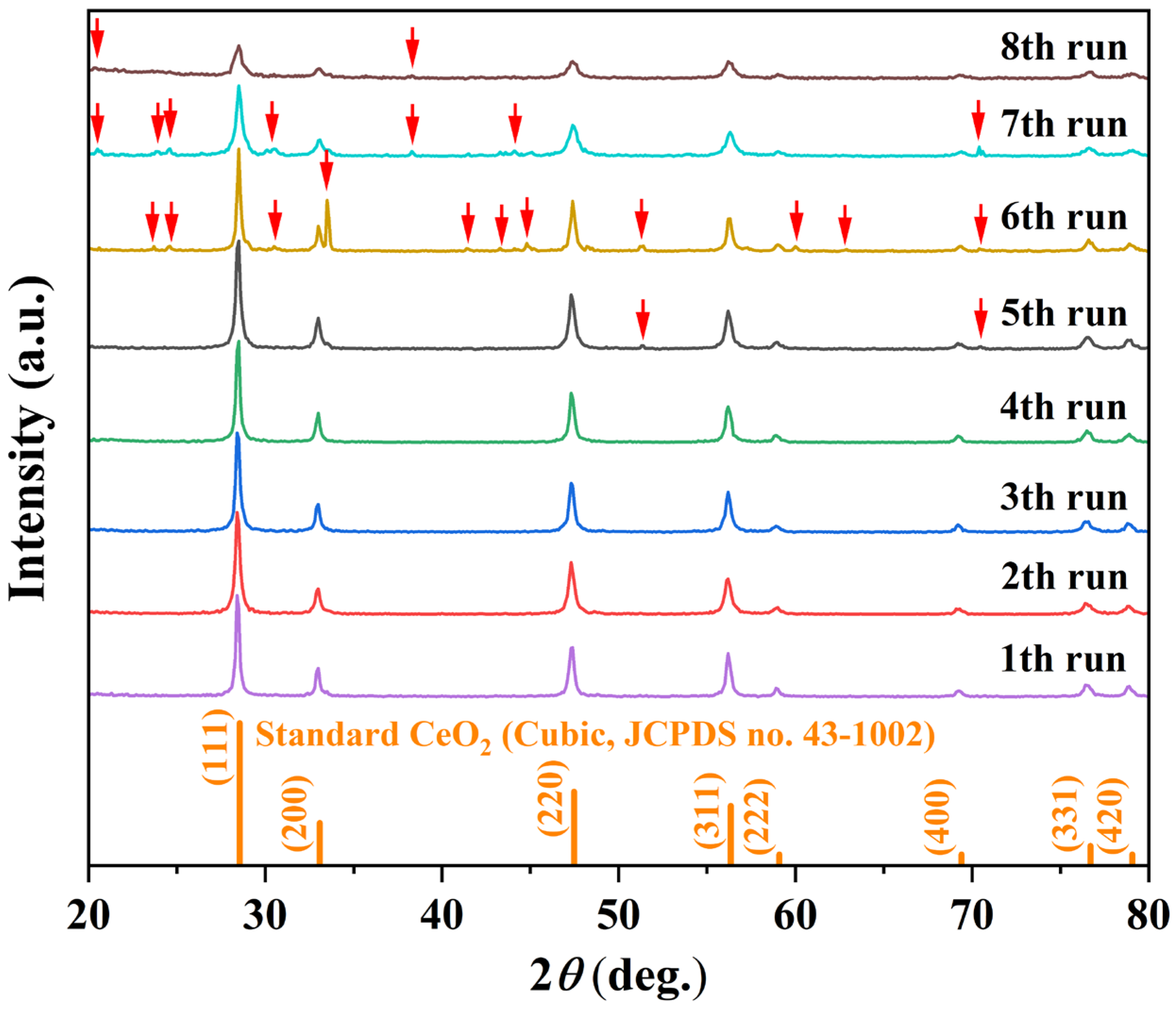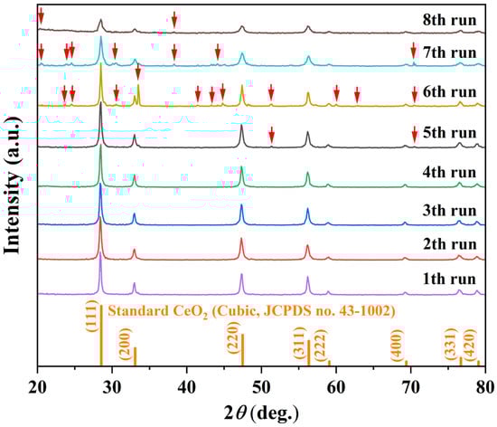 To align with green chemistry principles and enhance the sustainability of the synthesis [40], the solvothermal mother liquor was recycled over multiple cycles under fixed conditions (180 °C, 12 h, initial solvent: 15 mL MeOH + 5 mL H2O). Figure 7 displays the XRD patterns of CeO2 synthesized over successive recycling rounds. During the first four cycles, all diffraction peaks correspond exclusively to the cubic fluorite structure of CeO2, with no detectable secondary phases. The consistency in peak position, intensity, and profile indicates excellent retention of crystallinity and phase purity throughout these initial reuses, which is corroborated by the stable crystallite size (12.4–15.7 nm) and high relative crystallinity (65.3–65.8%) recorded in Table 4. However, upon the fifth cycle, two weak impurity peaks emerged at 2θ = 51.3° and 70.4°. By the eighth cycle, additional impurity peaks became evident (marked by red arrows in Figure 7), accompanied by a discernible decrease in the intensity of the characteristic CeO2 reflections. These emerging peaks are attributed to orthorhombic CeCO3OH (JCPDS no. 41-0013) and hexagonal CeCO3OH (JCPDS no. 52-0352). The appearance of these impurities suggests the gradual accumulation of dissolved species or reaction byproducts in the recycled mother liquor, which ultimately interfere with the crystallization process and promote the formation of secondary phases, consistent with the observed loss of well-defined octahedral morphology and the onset of irregular aggregates noted in Table 4 for cycles 5–8.