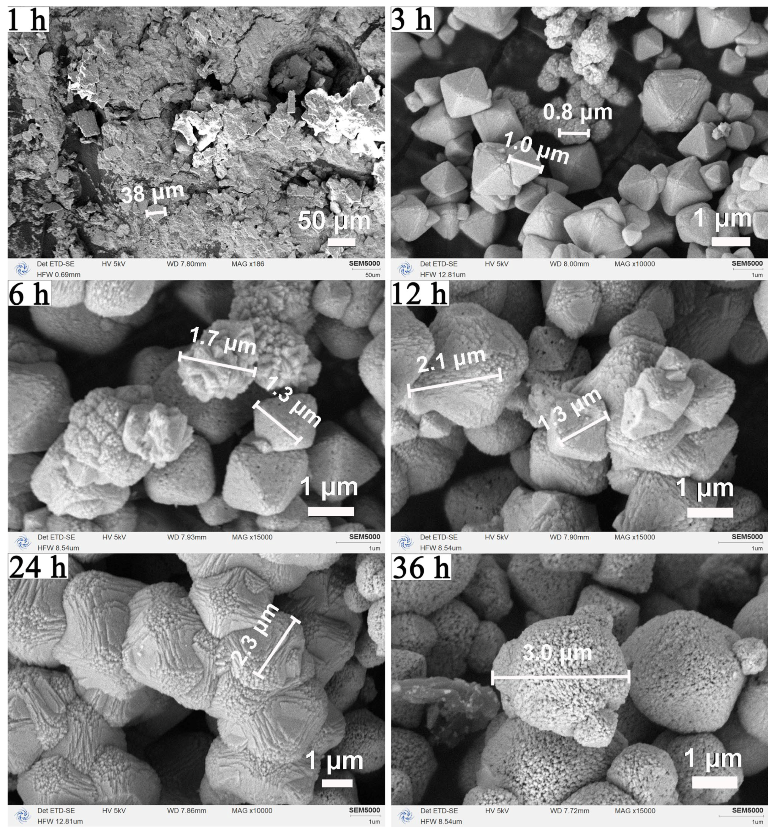 Morphological evolution of CeO2 with solvothermal duration: SEM images of CeO2 samples synthesized at 180 °C using a binary solvent of 15 mL MeOH and 5 mL H2O at different reaction times (1, 3, 6, 12, 24, and 36 h).