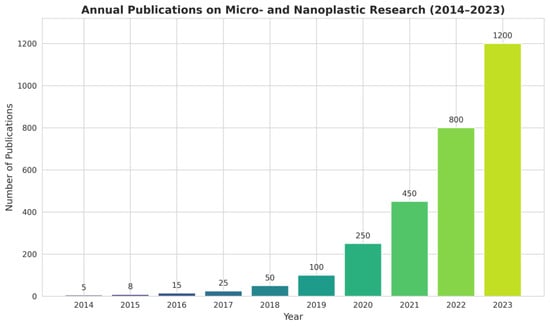 Annual trend of publications on micro- and nanoplastic research (2014–2023).