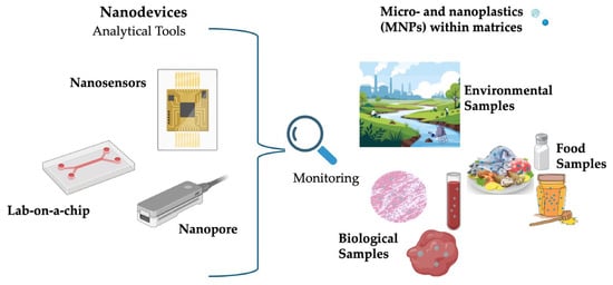 Biological matrices—such as human blood, placenta, breast milk, and various tissues—pose particularly formidable challenges. MNP concentrations in biological samples are often extremely low, and detection is complicated by the presence of proteins, lipids, and cellular debris [40,41]. Nanodevices incorporating biofunctionalized sensors have been developed to improve both sensitivity and selectivity. For instance, nanopore-based detection platforms allow real-time identification of particle size and polymer composition directly from biological fluids without extensive preprocessing. Other promising strategies include microfluidic platforms integrating cell lysis, immunocapture, and electrophoretic separation to isolate nanoplastics from plasma or tissue homogenates. Magnetic enrichment coupled with Raman spectroscopy has enabled detection of nanoplastics in human placenta samples, providing valuable insight into exposure pathways and potential health risks [42,43]. Rigorous validation is required, including reproducibility testing, specificity evaluation, inter-laboratory comparisons, regulatory acceptance, and the development of standardized reference materials and cross-platform calibration procedures [44]. Figure 3 schematizes the type of matrices that can be analyzed with nanodevices. Building on the role of nanodevices as functional platforms for MNP monitoring, the next section integrates these concepts within a broader discussion of nanotechnology-based detection strategies, emphasizing how nanoscale material engineering, surface functionalization, and hybrid sensing architectures collectively improve MNP detection.