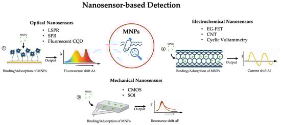 Overview of nanosensor-based technologies for MNP detection, categorized by signal transduction mechanism. ① Optical nanosensors exploit the interaction between light and metallic nanostructures; the binding of an MNP alters the local refractive index, causing a measurable shift in the absorption/resonance spectrum peak. ② Electrochemical nanosensors detect MNPs by measuring variations in electrical properties caused by particle adsorption onto the conductive nanomaterial surface. ③ Mechanical nanosensors function as micro-balances; the added mass of an MNP on the sensor surface induces static deflection or a detectable change in its mechanical resonance frequency.
