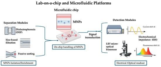 Schematic representation of lab-on-a-chip platforms for micro- and nanoplastic (MNP) analysis. Samples containing MNPs are introduced into the microfluidic chip, where separation and enrichment modules isolate MNPs. The enriched particles are subsequently detected through electrochemical impedance or optical signal transduction, providing quantitative analytical readout.