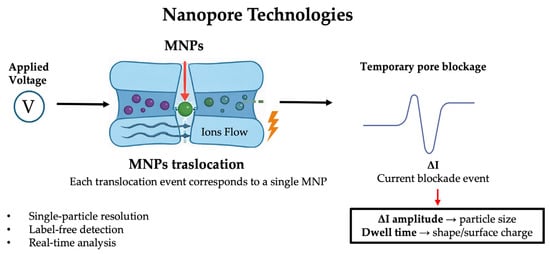 Nanopore-based detection is an approach that capitalizes on nanometer-scale pores to detect individual particles via ionic current fluctuations. Originally developed for DNA sequencing and protein analysis [66], nanopore systems are now being explored for synthetic nanoparticles and, more recently, for MNPs. In a typical nanopore experiment, a single nanopore is embedded in a membrane between two electrolyte chambers. When a voltage is applied, ions flow through the pore generating a baseline current; when an MNP translocates through the pore, it transiently blocks ion flow, producing a detectable current blockade whose amplitude and duration carry information about the size, shape, and surface properties of the particle [67]. This technique offers several compelling advantages for MNP analysis: single-particle resolution enabling direct size distribution measurement rather than averages; label-free operation and real-time detection; and by adjusting pore size or functionalizing pore walls (e.g., with charged or ligand moieties), one can steer selectivity toward certain particle types or surface chemistries.