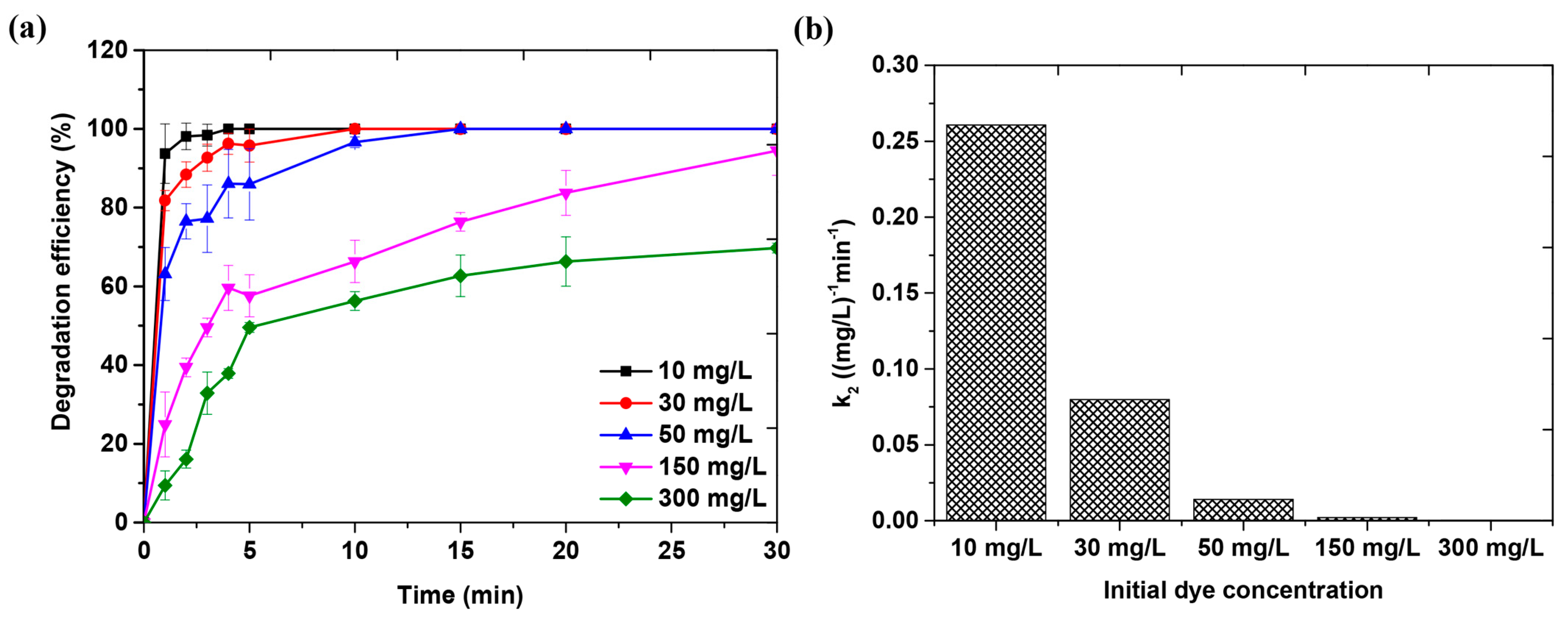 3.5.2. Effect of Initial Methyl Orange Dye Concentration