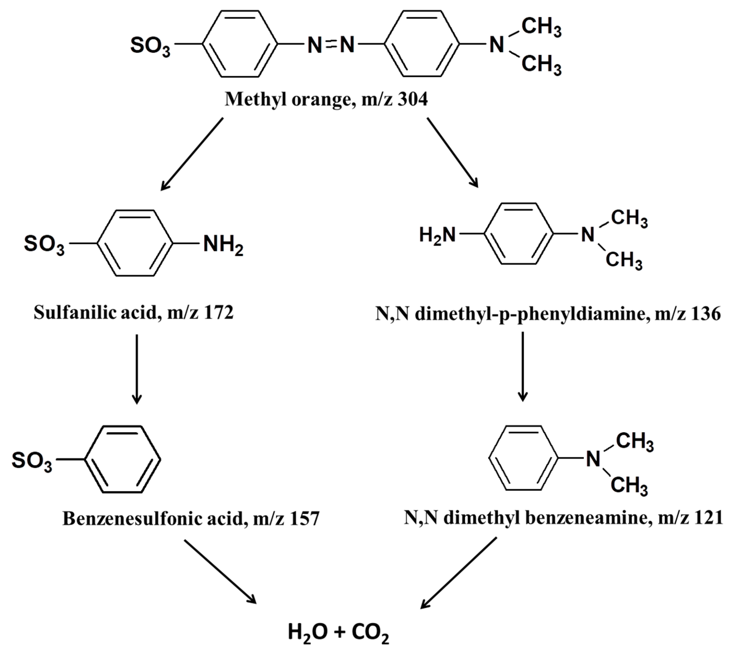 3.6. Methyl Orange Degradation Products and Pathway