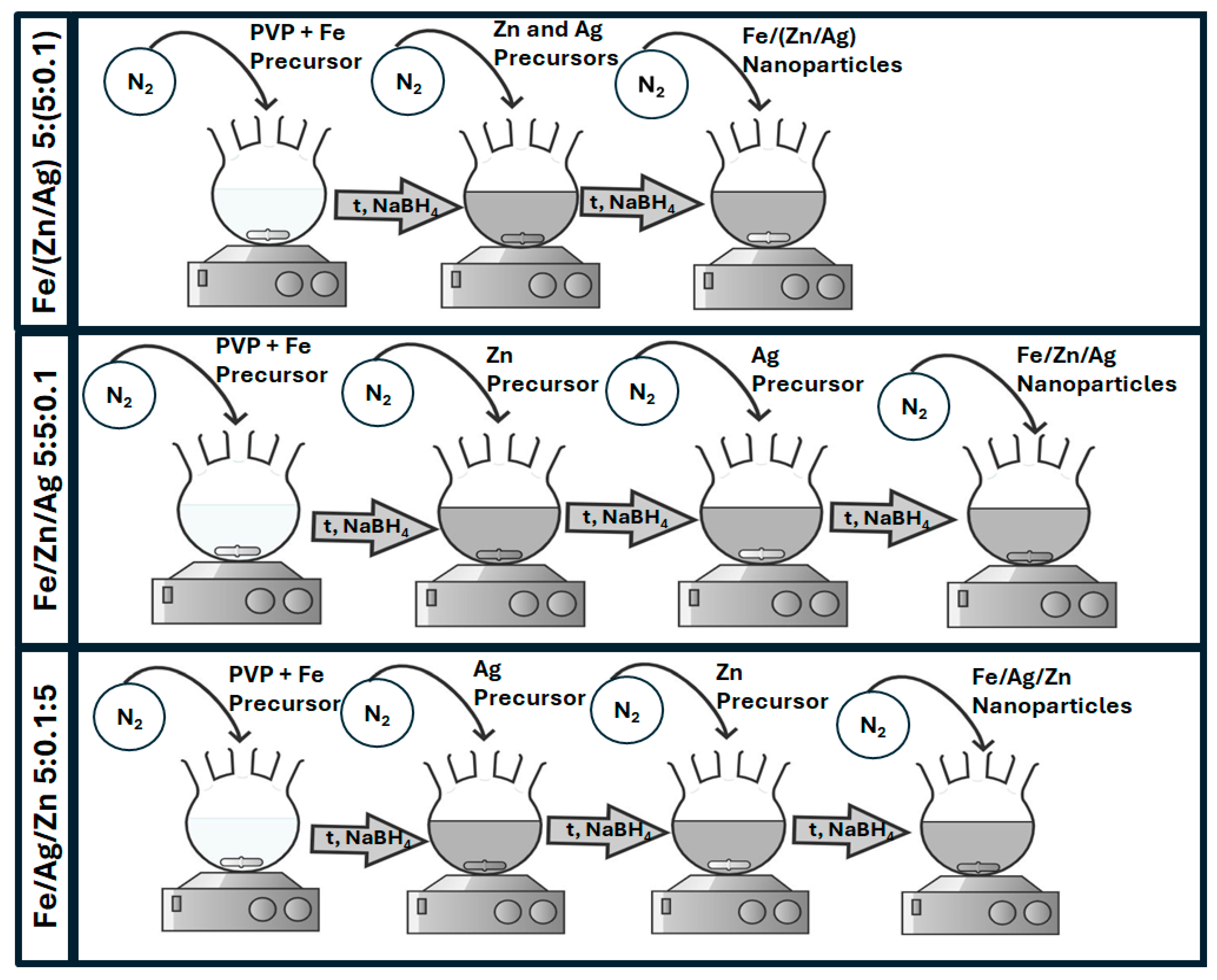 - Tseng, W.J.; Chuang, Y.-C. Chemical Preparation of Bimetallic Fe/Ag core/shell composite nanoparticles. J. Nanosci. Nanotechnol. 2017, 18, 2790–2796. [Google Scholar] [CrossRef] [PubMed]