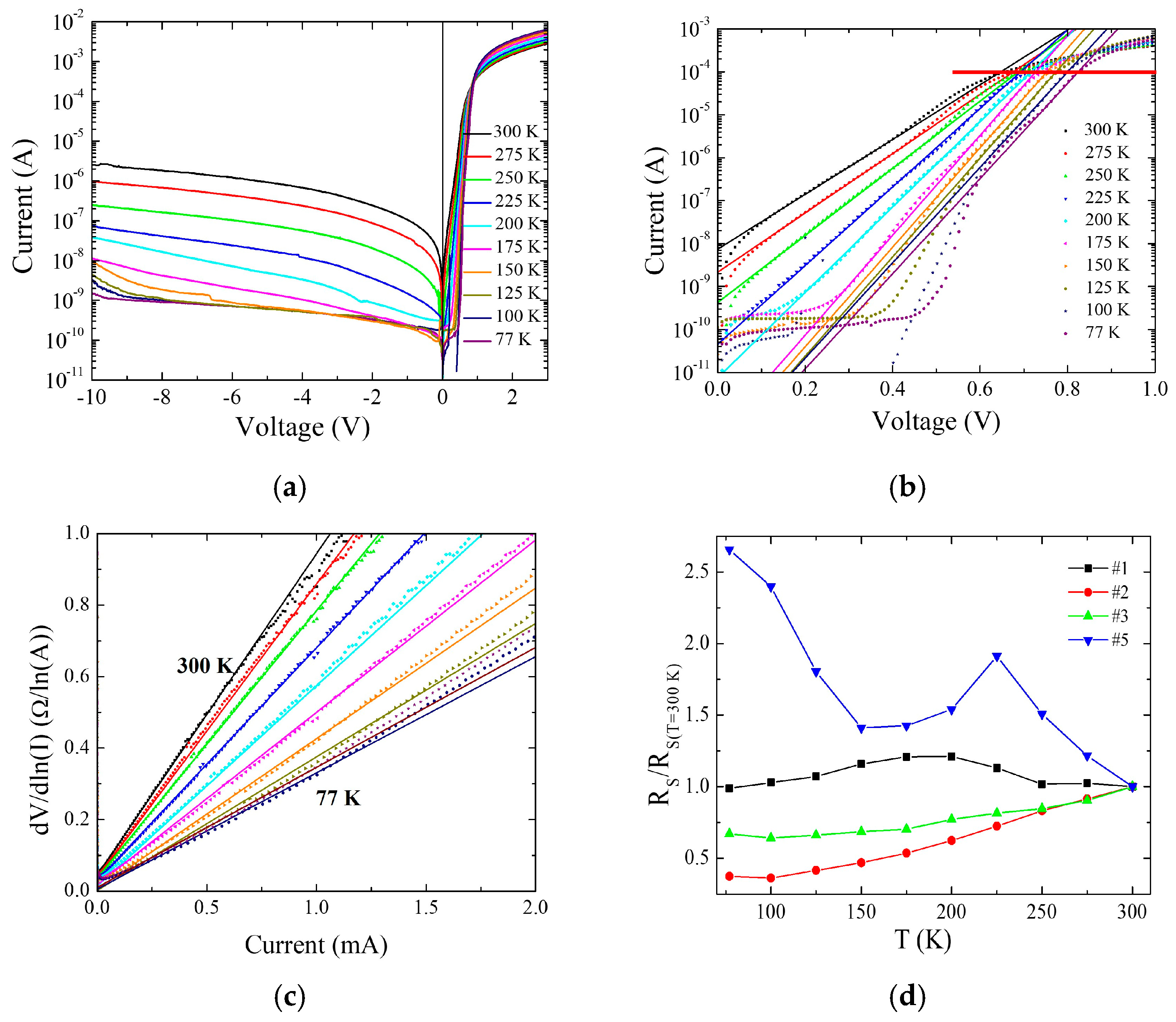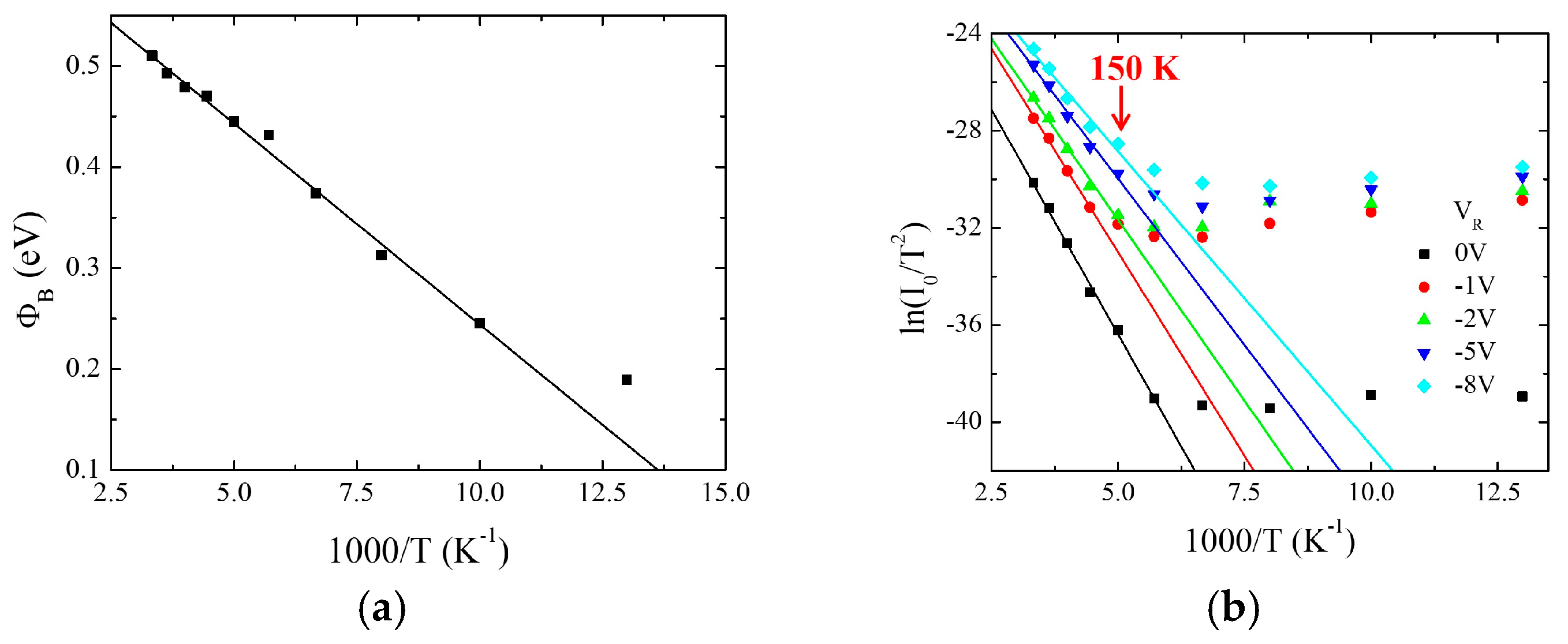 - Werner, J.H.; Güttler, H.H. Barrier inhomogeneities at Schottky contacts. J. Appl. Phys. 1991, 69, 1522. [Google Scholar] [CrossRef]