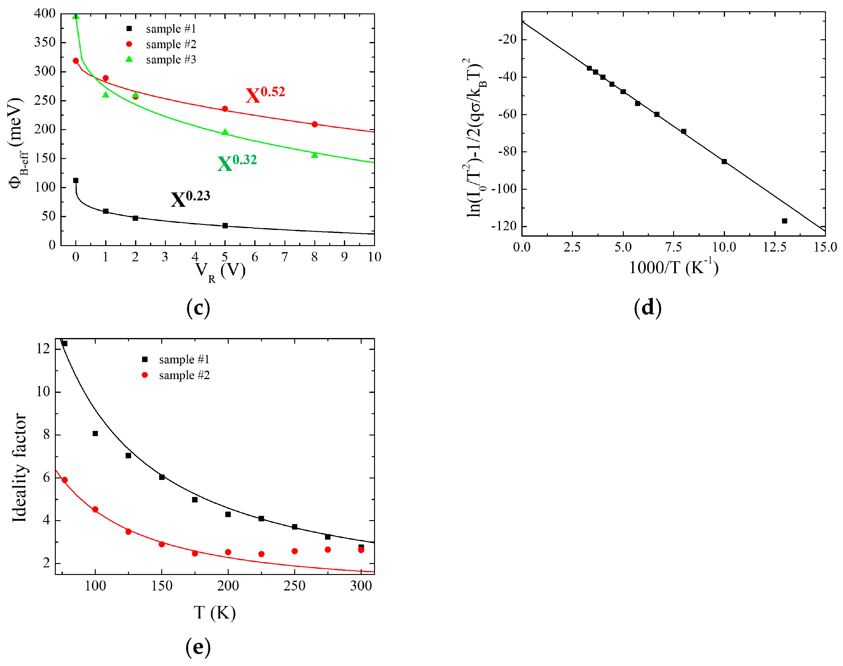 - Ru, G.-P.; Van Meirhaeghe, R.L.; Forment, S.; Jiang, Y.-L.; Qu, X.-P.; Zhu, S.; Li, B.-Z. Voltage dependence of effective barrier height reduction in inhomogeneous Schottky diodes. Solid-State Electron. 2005, 49, 606–611. [Google Scholar] [CrossRef]