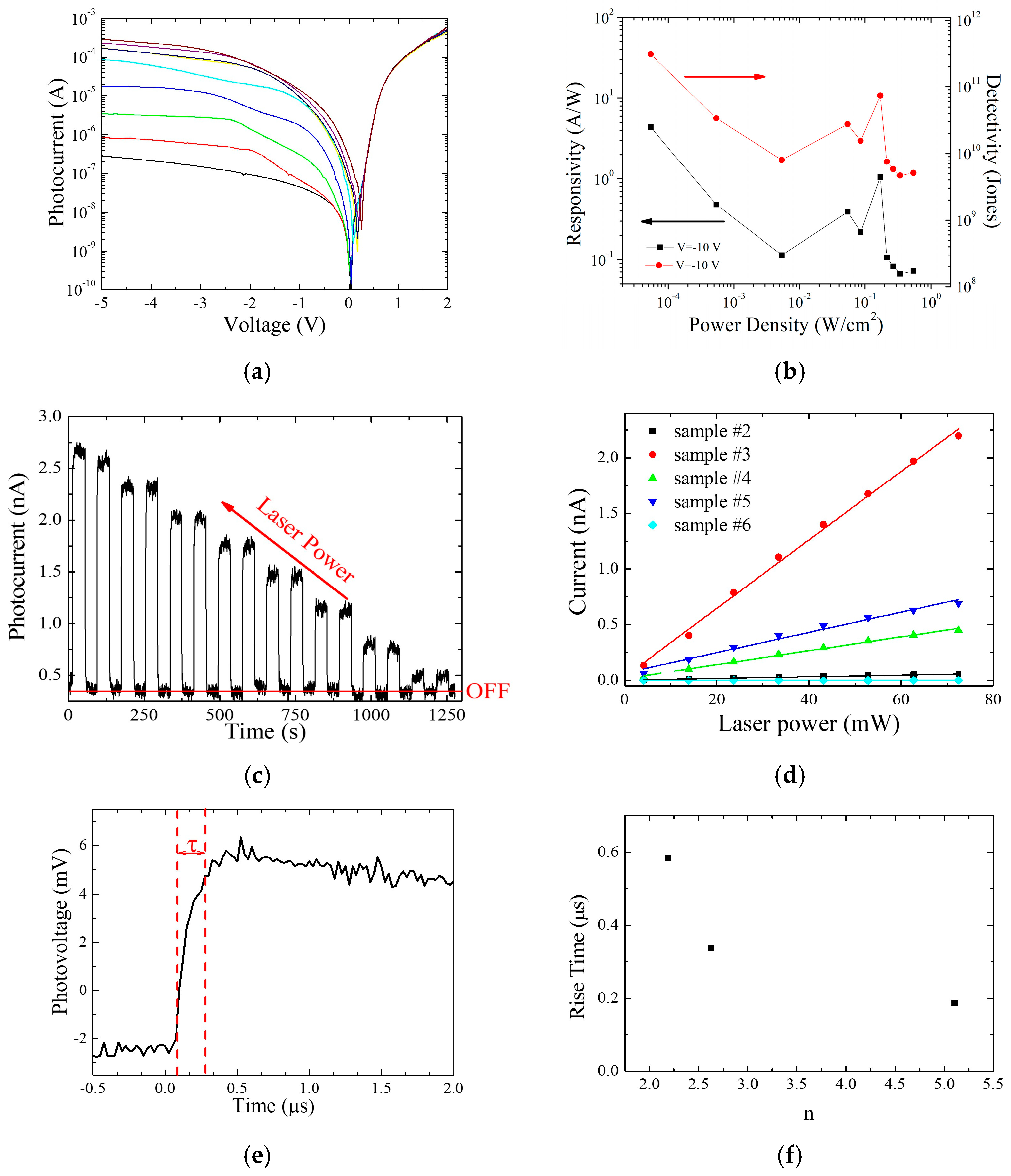 | Sample | Idark (A) | R (A/W) | D* (Jones) | Rise Time (ns) |