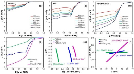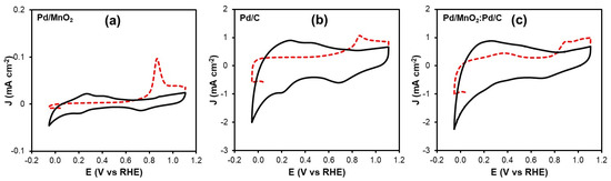Electrochemical tests revealed that the hybrid outperformed the individual components for both the ORR and HOR. It exhibited the lowest Tafel slope for the ORR (60.9 mV dec−1) and the highest exchange current density (8.59 × 10−5 mA cm−2), as well as improved HOR kinetics (Tafel slope of 35.0 mV dec−1, J0 = 5.68 × 10−5 mA cm−2). CO stripping analysis further showed that the Pd/MnO2:Pd/C hybrid possesses the highest electrochemically active surface area, enabling superior intrinsic (mass-normalized) activity toward both reactions and evidencing a more efficient utilization of Pd active sites.