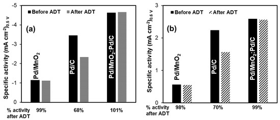 Although post-mortem structural characterization (e.g., SEM or XRD after ADT) was not performed in this study, the electrochemical durability trends observed here provide strong evidence of catalyst stability under alkaline conditions. The excellent retention of ORR and HOR activity for the Pd/MnO2:Pd/C hybrid suggests that the incorporation of MnO2 contributes to improved catalyst layer stability and enhanced utilization of Pd active sites through combined structural and interfacial effects. While the proposed role of MnO2 as a structural spacer and interfacial promoter is supported by textural, electrochemical, and durability trends, direct characterization of parameters such as ionomer distribution, wettability, or post-cycling morphology was beyond the scope of this work. These aspects will be the focus of future complementary studies.