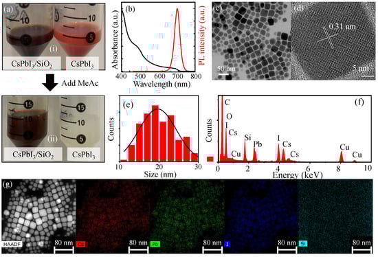 (a) A total of 5 mL of as-prepared CsPbI3 and CsPbI3/SiO2 pristine solution (i), and the two pristine perovskite solution after adding 5 mL methyl acetate into 5 mL (ii), where the insets are photographs of CsPbI3/SiO2 toluene solution under day light, respectively. (b) PL and absorption spectra of CsPbI3/SiO2 NCs. Given TEM (c) and HRTEM (d) images of CsPbI3/SiO2 NCs, the size distribution histogram was obtained (e) as well as the lattice spacing. (f) The energy-dispersive X-ray (EDX) spectrum of CsPbI3/SiO2 NCs. (g) For an STEM-HAADF image of CsPbI3/SiO2 NCs, the elemental mapping images of Cs, Pb, I, and Si were compared.
