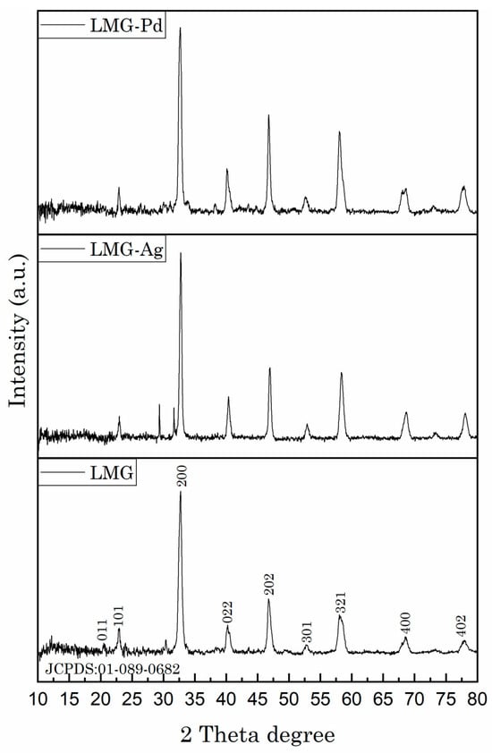 XRD patterns for the LMG, LMG-Ag, and LMG-Pd materials.