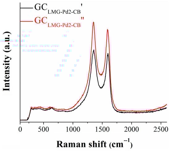The electrochemical stability of GCLMG-Pd2-CB was investigated during a 24 h chronoamperometric experiment at a constant potential value corresponding to i = −10 mA/cm2. After the first hour and until the end of the test, the recorded i-t curve (Figure 5c) shows shifts in current density, between −13 and −16 mA/cm2, indicating the relative stability of the studied electrode. The inset of Figure 5c presents the cathodic polarization curves obtained before (GCLMG-Pd2-CB′) and after (GCLMG-Pd2-CB″) the amperometric experiment. The ηHER value at i = −10 mA/cm2 increased by ~40 mV following the test. Because this difference is somewhat higher than the differences often observed when performing stability tests relevant to the water splitting domain [40,41,42], Raman analysis was used to verify the occurrence of any changes in the chemical structure of the electrocatalyst. The spectra recorded on the GCLMG-Pd2-CB electrode, before (GCLMG-Pd2-CB′) and after (GCLMG-Pd2-CB″) the stability test, are given in Figure 6.