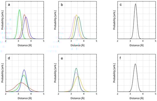 RDFs of the interlayer distances in the rGO are presented as follows. Each RDF is constructed over the averaged distance between 6 ring pairs. (a) RDFs of the distances between 3 of the ring pairs between the top and the middle layer; (b) RDFs of the distances between the remaining 3 ring pairs between the top and the middle layer; (c) RDF of the averaged distance between all 6 ring pairs; (d) RDFs of the distances between 3 of the ring pairs between the middle and the bottom layer; (e) RDFs of the distances between the remaining 3 ring pairs between the middle and the bottom layer; (f) RDF of the averaged distance between all 6 ring pairs. The RDFs of the ring pairs are represented by colored lines. The interlayer distance RDFs are represented by black lines. The selected ring pairs are visualized in Figure S3.