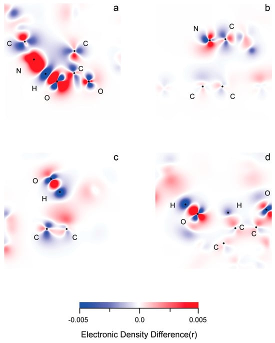 As expected within intermolecular interactions involving electronic systems with opposite charges, the atoms which are directly involved undergo density changes with a reverse sign (Figure 8 and Figures S7–S9). There appears to be an alternation in gain (+) and loss (−) of ED within the structure of functional groups participating in non-covalent interactions with a single atom. An example of such an alternation is designated by AO type in Figure S9 (hydrogen bonding). Because of the self-repulsion of the electronic density, a gain in one molecular orbital would provoke loss in a neighboring one, and vice versa. Occasionally, neighboring MOs overlap to form one electronic cloud, regardless of their spatial symmetry, just as long as they are all either donors or acceptors (Figure S8).