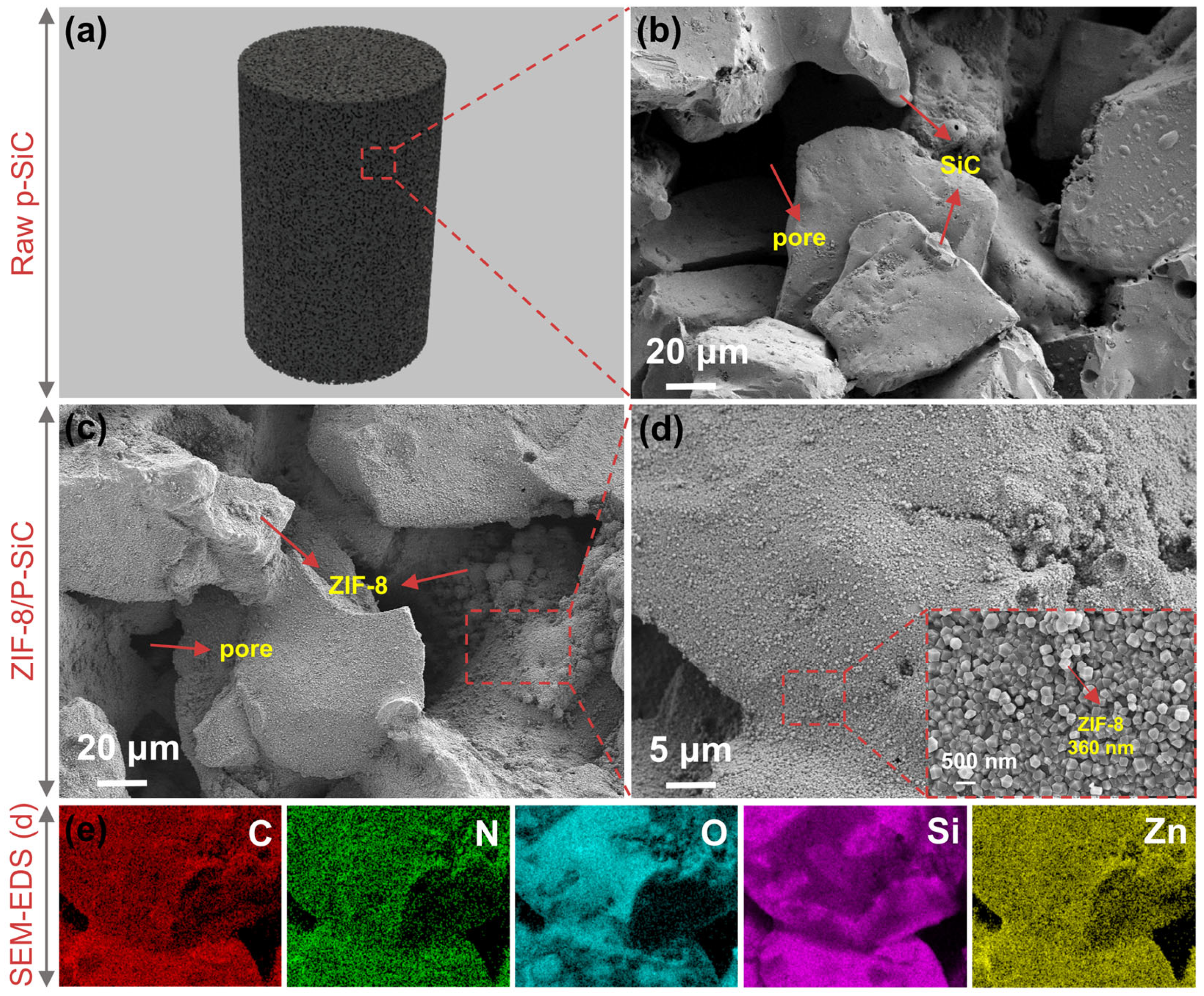 APA StyleZhou, L., Liao, G., Lin, T., Huang, W., Zhang, J., Fan, R., Li, Y., Zhang, X., Cheng, Z., & Xiao, L. (2026). In Situ Growth of Metal–Organic Frameworks (MOFs) Within Porous Silicon Carbide (p-SiC) for Constructing Hierarchical Porous Composites. Nanomaterials, 16(2), 117. https://doi.org/10.3390/nano16020117