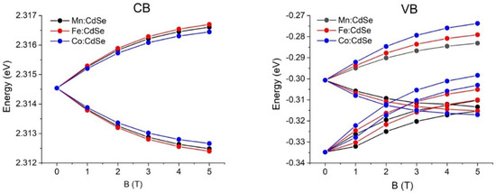 Single-particle spectra of Mn:, Fe: and Co:CdSe nanocrystals as a function of the external applied magnetic fields. CB and VB represent the conduction and valence bands, respectively.