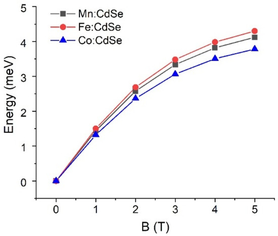 Electron spin-splitting energies of Mn:, Fe: and Co:CdSe nanocrystals as a function of the external applied magnetic fields.