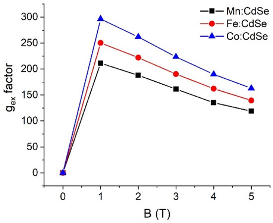 Exciton g-factor values (gex) of Mn:, Fe: and Co:CdSe nanocrystals as a function of the external applied magnetic fields.