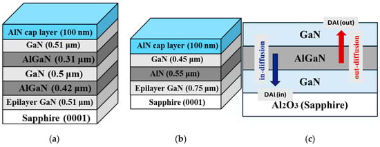 Schematic diagrams of GaN heterostructures grown on sapphire substrates: (a) AlN (cap)/GaN/2 × (AlxGa1−xN/GaN), and (b) AlN (cap)/GaN/AlN/GaN. (c) Schematic diagram illustrating the in-diffusion and out-diffusion mechanisms in the AlGaN/GaN/sapphire heterostructure. The blue and red arrows represent the direction of in-diffusion (towards the substrate) and out-diffusion (towards the surface), respectively.