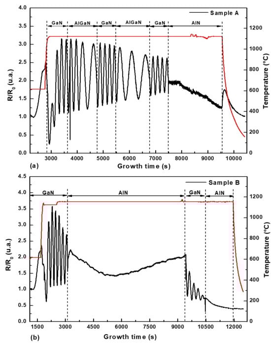 In situ reflectivity (black line) and growth temperature (red line) as a function of real time during the deposition of (a) AlN (cap)/GaN/2 × (AlxGa1−xN/GaN) and (b) AlN (cap)/GaN/AlN/GaN.