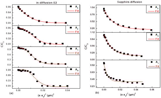 The increase in broadening observed in the profiles A1–A3 and B1–B3 suggests a direct increase in the Al diffusion coefficient (DAl) as the thermal annealing temperature increases. This temperature dependence is crucial for understanding and controlling thermal stability at the AlGaN/GaN and AlN/GaN interfaces. To quantify this process, the SIMS data was successfully fitted using the Gaussian function solution to Fick’s second law, as shown in Figure 4, confirming that the diffusion process can be accurately modeled across various interfaces.