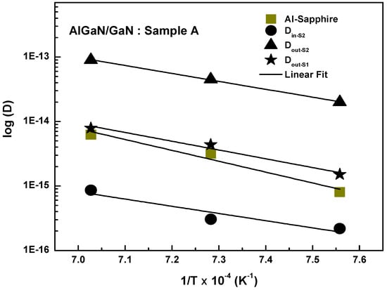 The extracted activation energies (Ea) and pre-factors (D0) provide the microscopic interpretation of the diffusion mechanism. The Dout-S2 (out-diffusion from AlGaN) is characterized by the following equation: