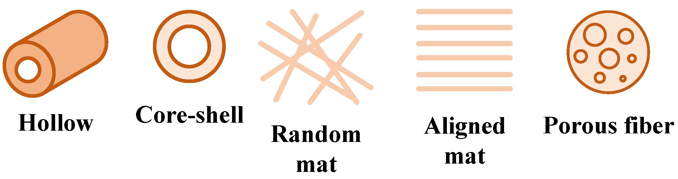 - Xue, J.; Wu, T.; Dai, Y.; Xia, Y. Electrospinning and Electrospun Nanofibers: Methods, Materials, and Applications. Chem. Rev. 2019, 119, 5298–5415. [Google Scholar] [CrossRef]