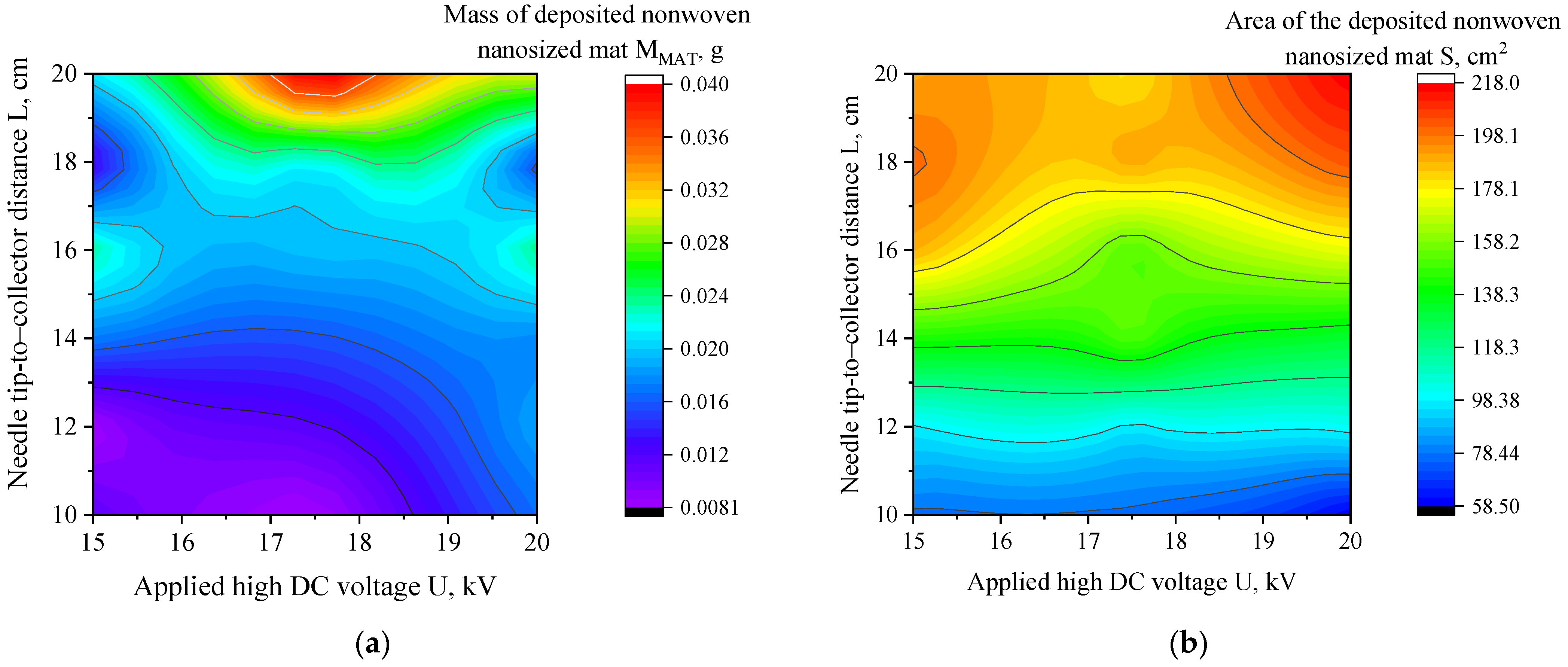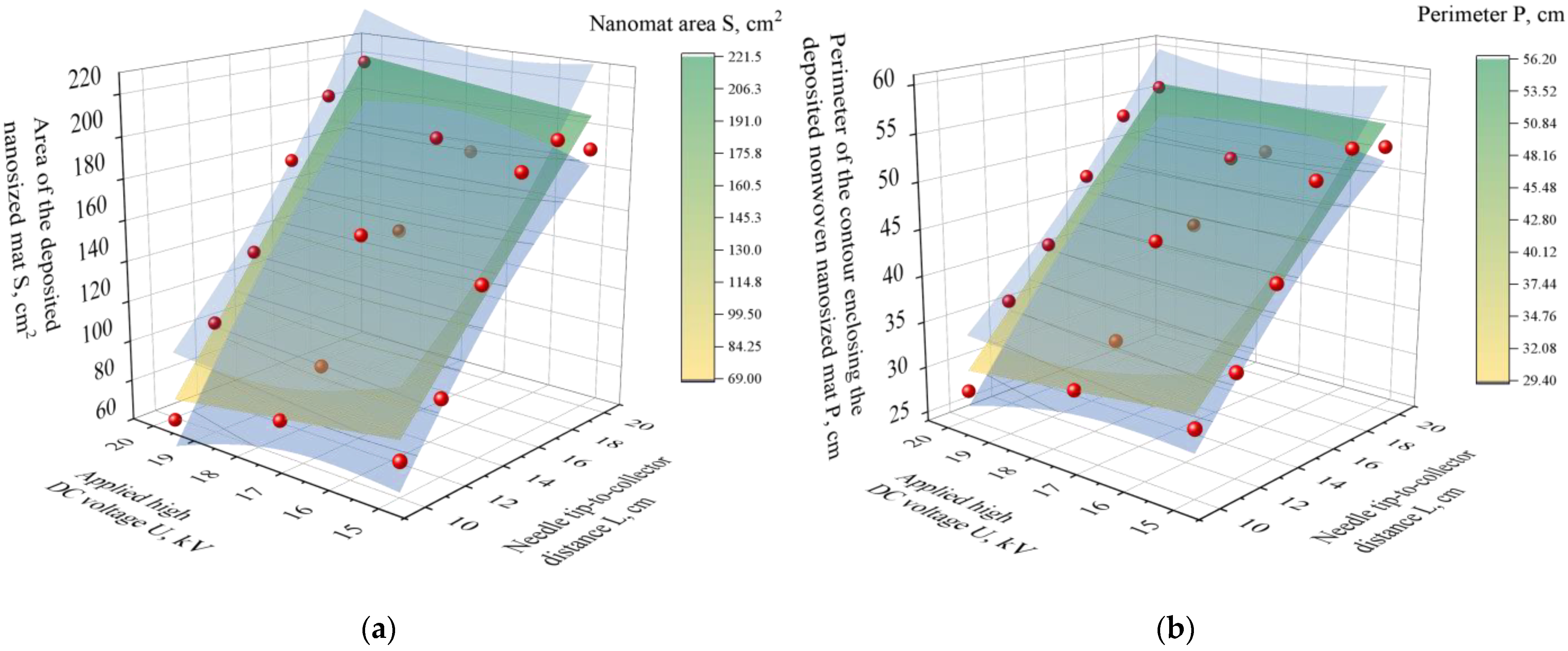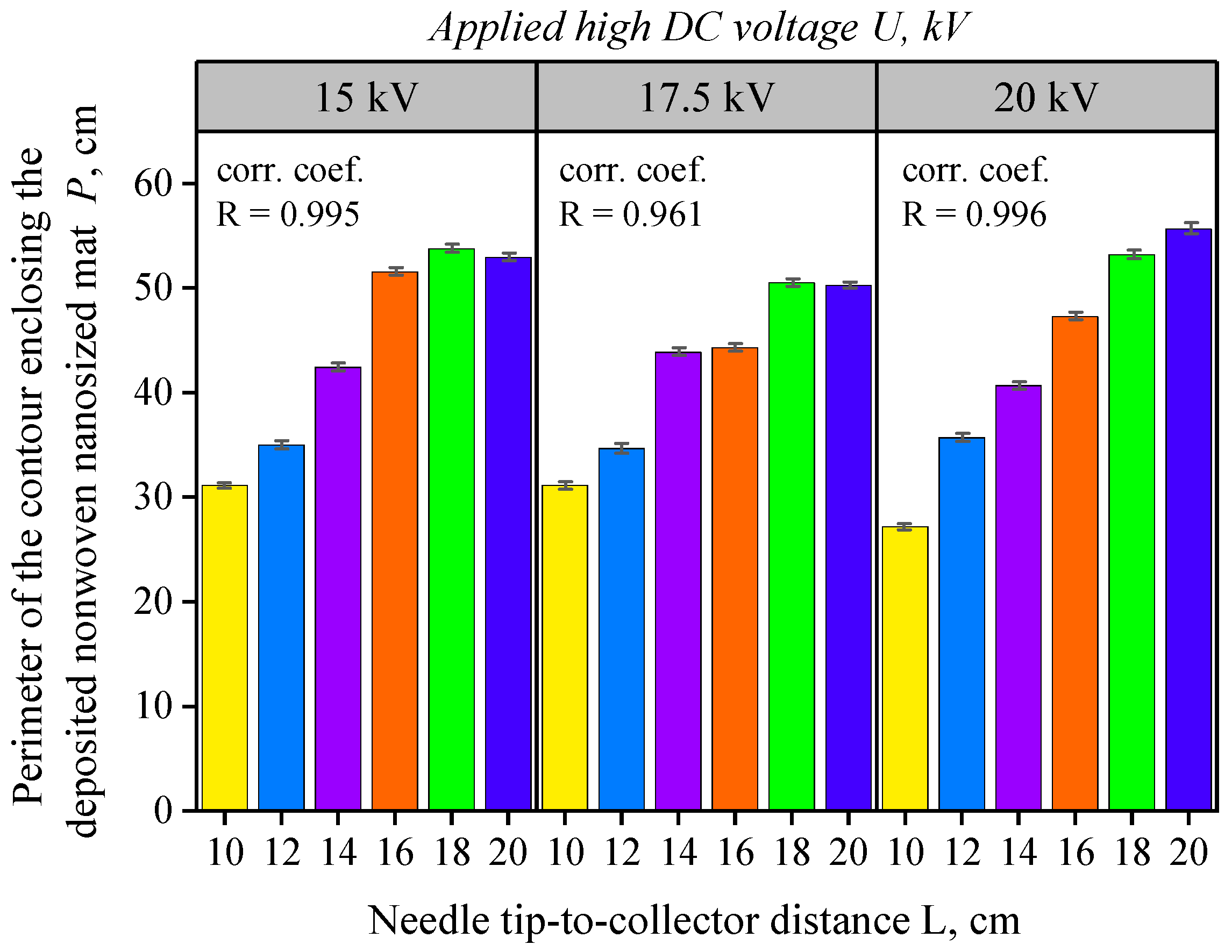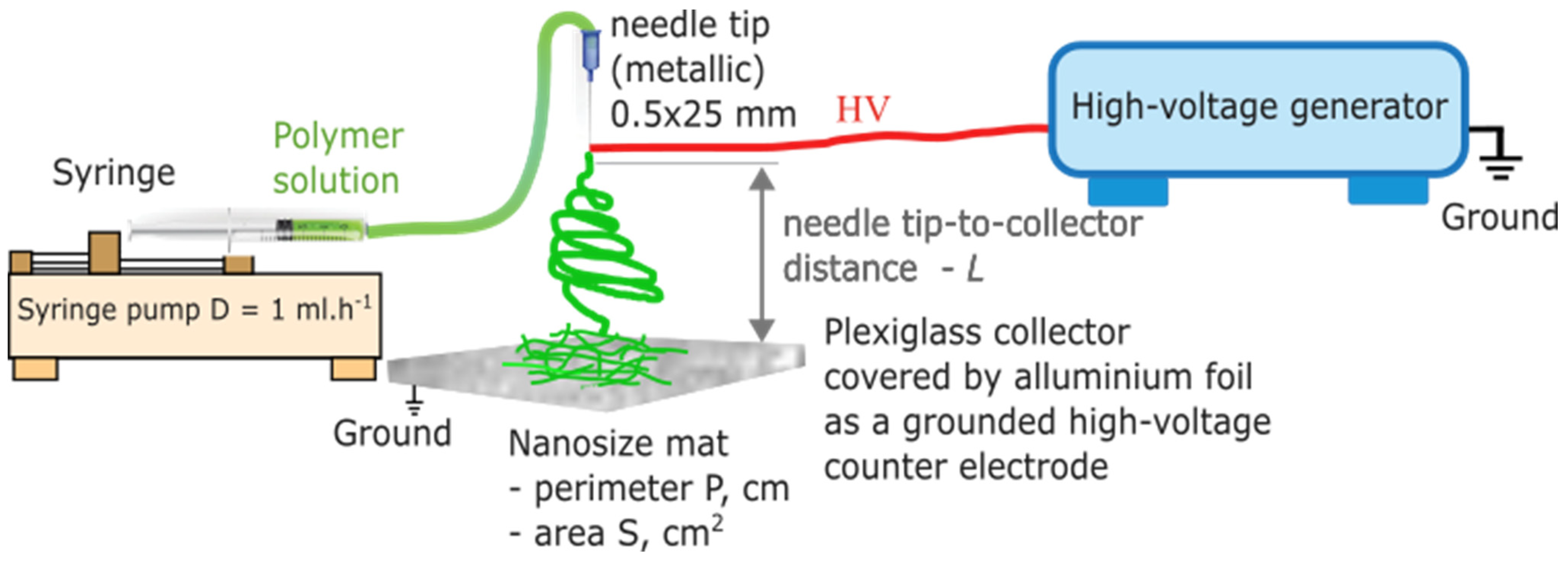 - to quantify the influence of the applied voltage U and needle tip-to-collector distance (L) on geometric descriptors of nanofiber deposition, including mat area and perimeter, under top-down vertical electrospinning conditions;