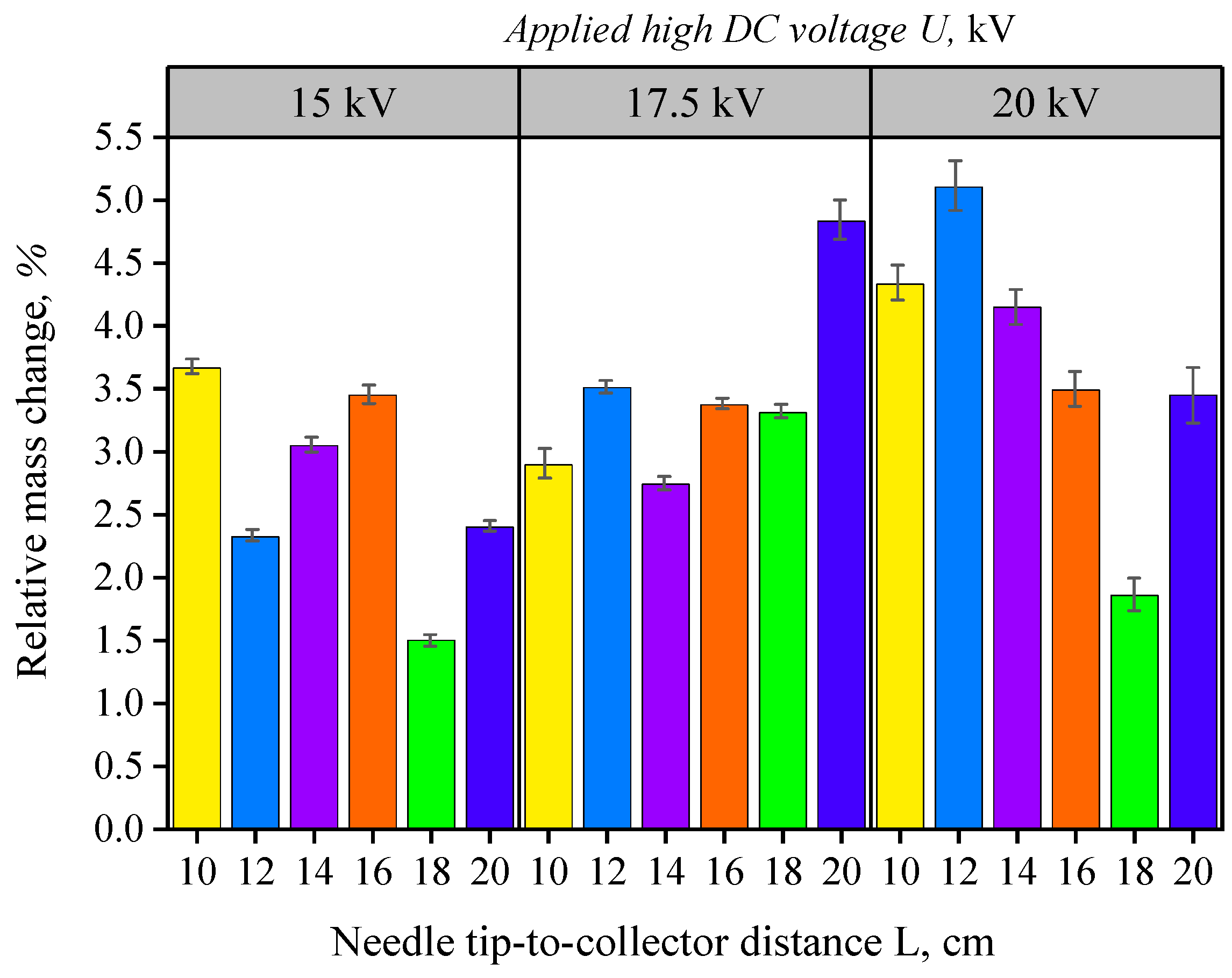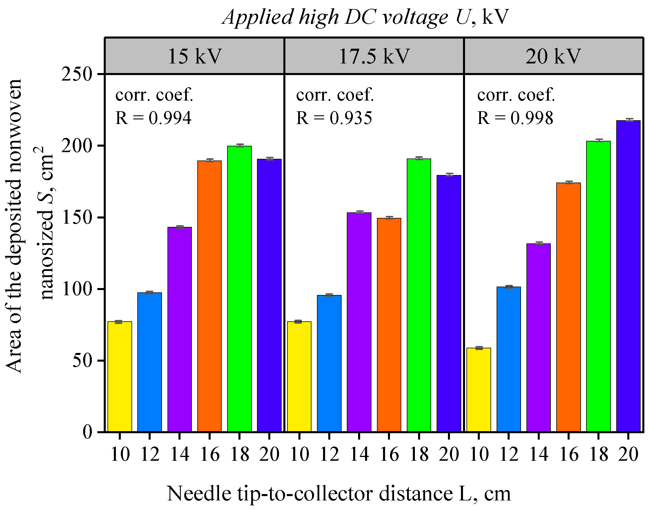 - For all three tested voltage values (U = 15, 17.5, and 20 kV), the mat-covered area increases as the tip-to-collector distance increases;