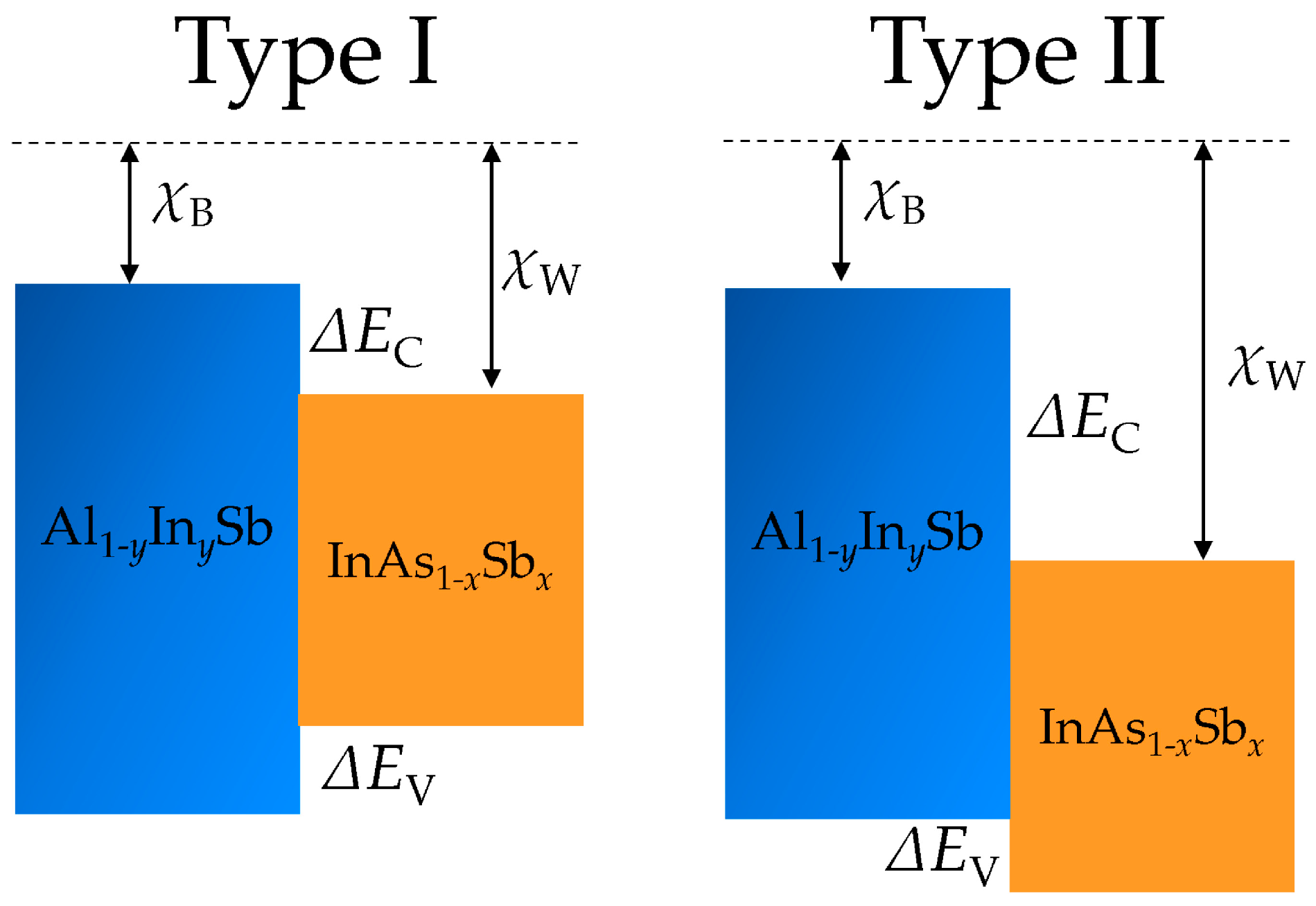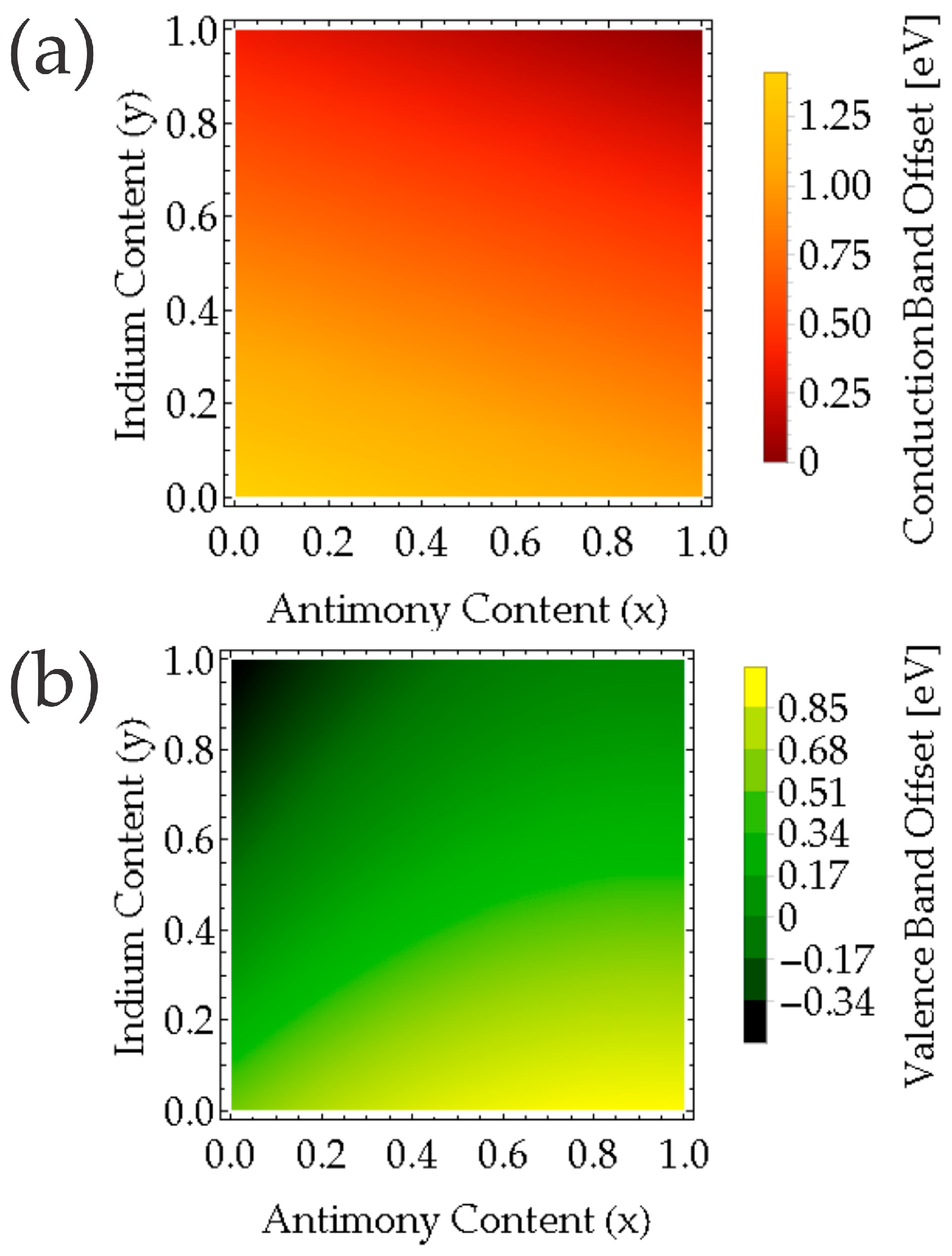 3.2. Band Alignment and Type-I/II Criteria in InAs1−xSbx/Al1−yInySb Interface