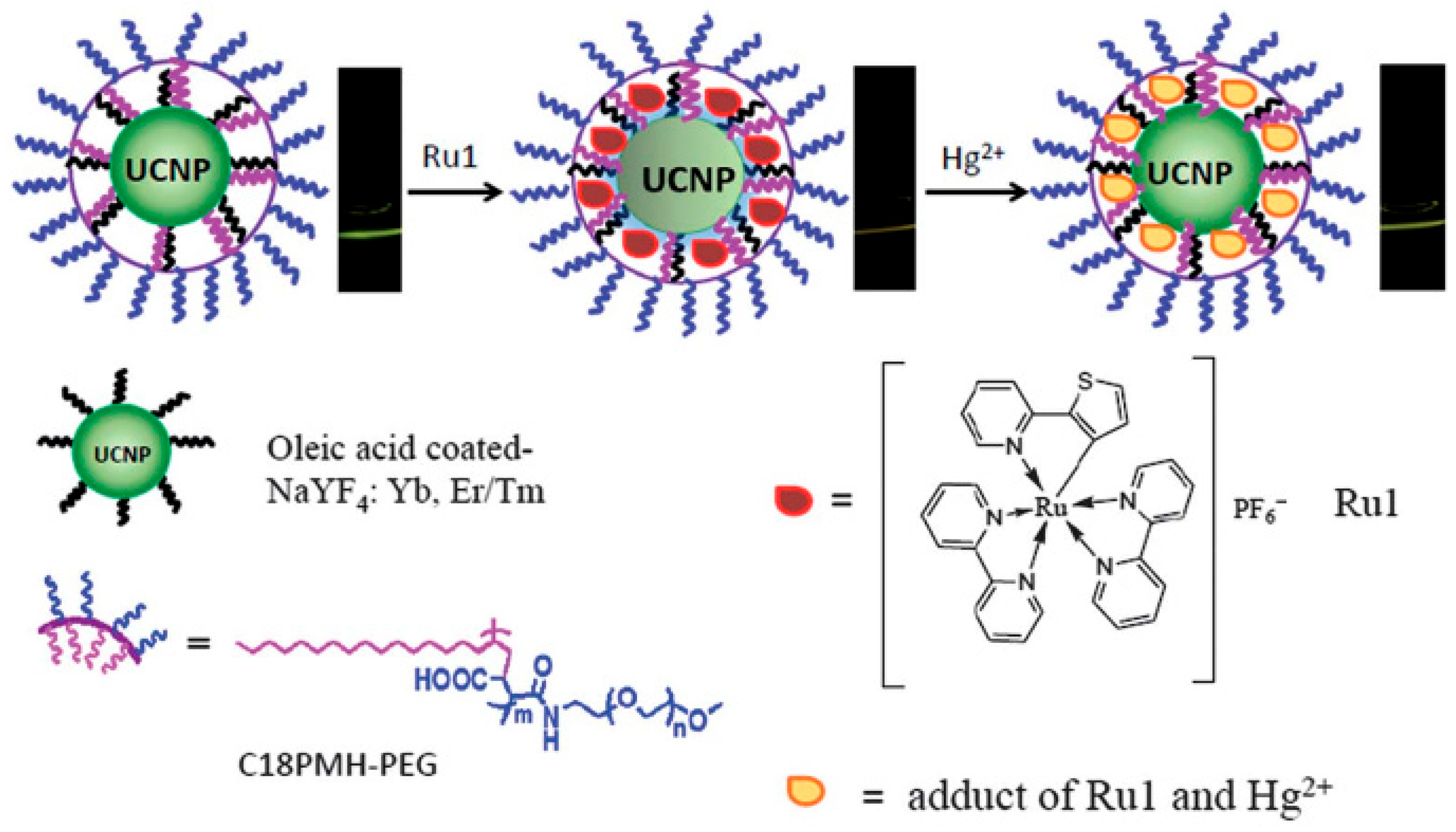- Li, X.; Wu, Y.; Liu, Y.; Zou, X.; Yao, L.; Li, F.; Feng, W. Cyclometallated ruthenium complex-modified upconversion nanophosphors for selective detection of Hg2+ ions in water. Nanoscale 2014, 6, 1020–1028. [Google Scholar] [CrossRef]