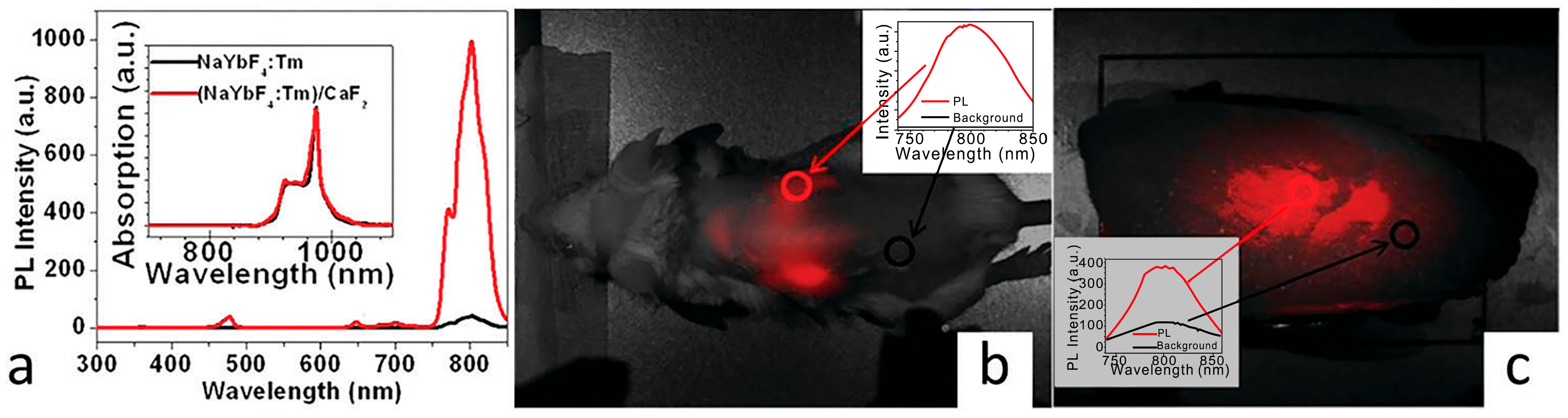 - In vivo tissue imaging. Chatterjee et al. [79] first reported the use of upconversion nanoparticles for in vivo imaging of deep tissue in Wistar rats. In their study, NaYF4:Yb coated with PEI (5 wt %) and Er UCNPs were first used, and then 100 μL PEI-coated UCNPs (4.4 mg/mL) were injected subcutaneously into the groin and thigh sites of rats at a depth of 10 mm. The rats were then stimulated with a 980 nm excitation light source. The results showed that UCNPs injected into the skin of the abdomen, the muscle of the thigh and under the skin of the back showed visible fluorescence under a 980 nm excitation light source. However, when the quantum dots (used as a control) were injected into the thicker skin of the back or abdomen, they did not show any fluorescence under UV excitation, and only the quantum dots injected into the translucent skin of the feet fluoresced. Thus, NIR radiation has been demonstrated to have better penetration than UV light, and NIR light-stimulated UCNPs has great potential for in vivo imaging and their application in tumor therapeutics. However, judging from the existing literature, the use of UCNPs for in vivo imaging is still at a preliminary stage.