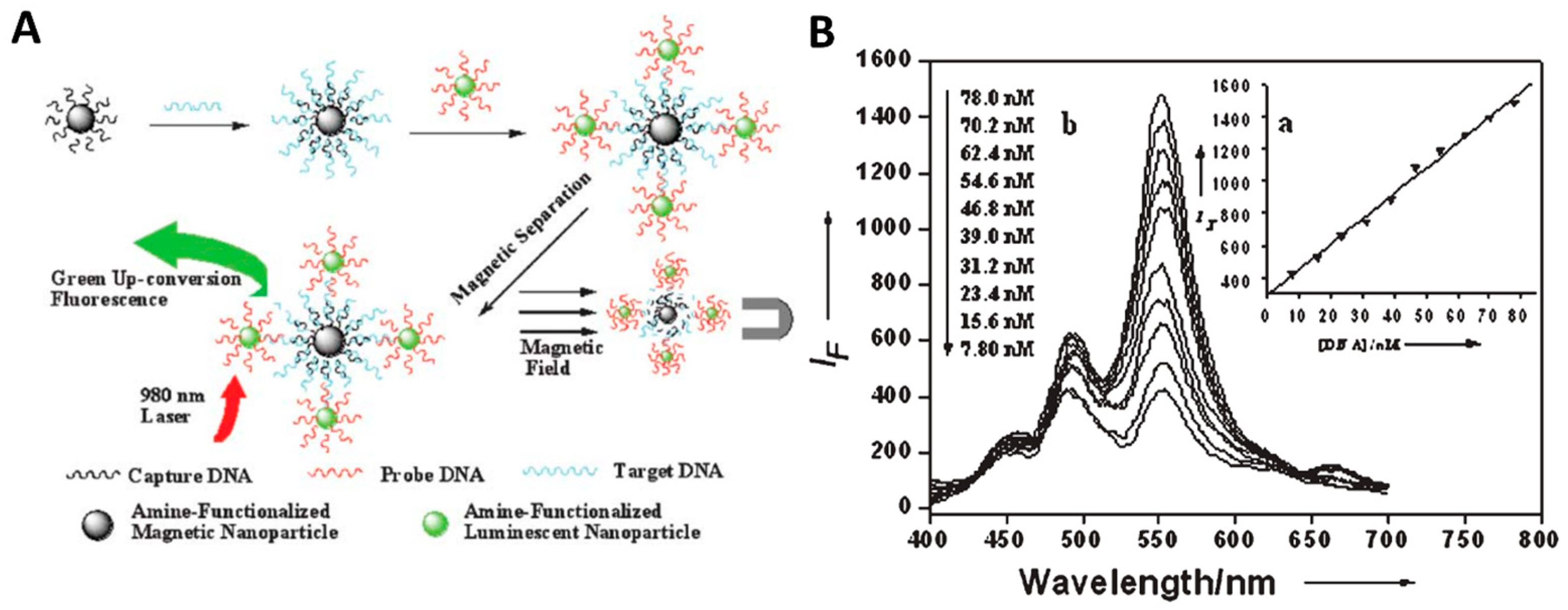 - Direct detection of biomolecules, also known as heterophase detection, refers to the specific recognition and high affinity between the molecules to be measured fixed on the substrate and the rare-earth-doped UCNPs labeled probe molecules [80,81,82,83,84]. The detection based on bioaffinity system is realized according to the proportional relationship between the concentration of the object to be measured and the fluorescence intensity [85]. Wang et al. [86] used NaYF4:Yb, Er UCNPs to design a fluorescence sensor based on magnetic field separation to detect trace DNA sensitively (Figure 8). Firstly, Fe3O4 magnetic nanoparticles were covalently linked to the capture DNA, and NaYF4:Yb, Er UCNPs were covalently linked to the probe DNA. When the target DNA is added to the system, the long strand of target DNA can specifically recognize the complementary sequence fragments on the trapping DNA connected to the Fe3O4 magnetic nanoparticle and the probe DNA connected to the UCNPs, and finally form a three-strand nanocomplex, which is then purified by magnetic separation. It was found that the upconversion fluorescence intensity of UCNPs was linearly correlated with the concentration of target DNA in the range of 7.8–78.0 nm. This method is a good choice for detecting trace amounts of DNA.