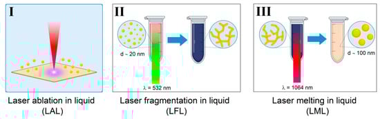 Nanoparticle shape modification is often achieved using laser melting in liquid techniques [21,22,23]. Laser melting of metallic nanoparticles has been used in laser nanotechnology for spheroidization of initially non-spherical NPs [24]. Generally, two types of nanoparticle melting are distinguished: localized surface melting of nanoparticles, which is achieved using ultrashort (femto- and pico-) laser pulses [25], and complete melting of nanoparticles, which is usually observed using nanosecond pulses [26]. Potentially, sequential melting and subsequent aggregation of molten nanoparticles could be used to circumvent the size limitations of laser ablation and laser fragmentation methods.