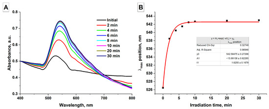 Effect of laser irradiation duration; (A) Normalized absorption spectra of aqueous colloids of gold nanoparticles depending on irradiation time (λ = 1064 nm, ε = 30 μJ, energy density—98 mJ/cm2); (B) Position of the plasmon resonance peak in the absorption spectra of aqueous colloids of gold nanoparticles depending on irradiation duration. The red line represents the data fit.