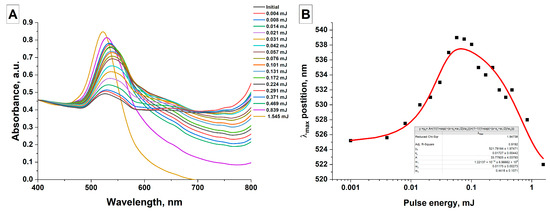 Effect of laser pulse energy; (A) Normalized absorption spectra of aqueous colloids of gold nanoparticles as a function of laser pulse energy (λ = 1064 nm, t = 8 min); (B) Position of the plasmon resonance absorption peak in the absorption spectra of aqueous colloids of gold nanoparticles as a function of pulse energy. The red line represents the data fit.