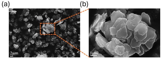 The SEM micrographs of the ZrP–CHX hybrid (Figure 2a,b) reveal that the material retains the typical lamellar morphology of zirconium hydrogen phosphate. The particles exhibit pseudo-hexagonal platelets with micrometric lateral dimensions, consistent with the crystalline habit of α-ZrP. At lower magnification, the powder appears as an assembly of agglomerated lamellar crystallites, whereas higher-magnification images highlight the stacked platelet architecture, with well-defined edges and smooth basal surfaces.