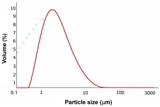 The PSD of ZrP-CHX (Figure 3) exhibits a narrow, unimodal profile, indicating good homogeneity of the powder after milling and sieving. The distribution is centred around micrometric particle sizes, with characteristic values of d(0.1) = 1.06 μm, d(0.5) = 2.12 μm, and d(0.9) = 4.85 μm. This indicates that 50% of the particle volume lies below approximately 2 μm and that most of the sample (90%) consists of particles smaller than 5 μm.