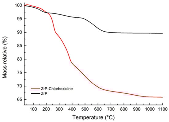 Thermogravimetric curves of pristine zirconium hydrogen phosphate (ZrP, black) and the ZrP–chlorhexidine intercalation compound (ZrP-CHX, red).
