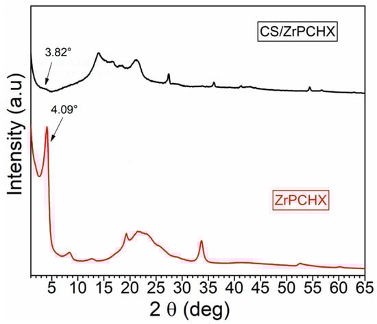 The ZrPCHX active filler and the ZrPCHX-based CS film were compared by WAXS analysis to evaluate the structural and morphological properties of the composite film.