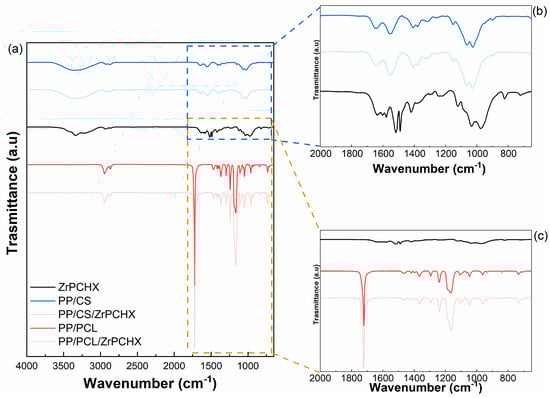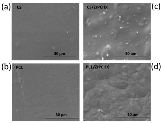 The CS- and PCL-based dispersions were then poured into plastic Petri dishes (diameter ≈ 5 cm) and dried under ambient temperature and humidity conditions until complete solvent evaporation, obtaining self-supporting films with a thickness of 25–35 μm, coded as follows: CS/ZrPCHX and PCL/ZrPCHX. The self-standing films were produced for the purpose of conducting characterization analyses. Subsequently, the corresponding formulations were employed to obtain coatings on substrates (with a thickness of approximately 10–15 μm). Pure CS and PCL films (without additives) were prepared and tested for comparative purposes.