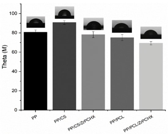 The wide characterization of the CS-based and PCL-based active coatings highlights the following results: Morphological analysis confirmed the homogeneous distribution of the active compound within both polymer matrices. Contact angle measurements showed that the surface wettability can be effectively tuned by the nature of the polymer matrix and the presence of antimicrobial particles: while CS-based coatings generally increased hydrophobicity, the incorporation of ZrPCHX enhanced hydrophilicity, potentially favouring better interaction with aqueous environments and microbial cells. FTIR analysis demonstrated that the addition of ZrPCHX does not alter the chemical structure of the polymer backbones, preserving the intrinsic properties of both CS and PCL. Adhesion tests confirmed excellent coating–substrate (PP) interactions, indicating an essential characteristic for real applications where prolonged exposure to moisture, mechanical stress, and cleaning agents is expected.