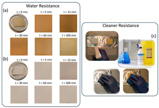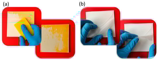 Adhesion was performed by the Type Test, according to ASTM D3359—Method A—by applying and removing pressure-sensitive transparent tape (number “# 600” of 3M with a width of 10″) over cuts made in the film on different substrates. In detail, on a 10 × 10 cm2 area, free of surface imperfections, different cuts (each about 10 mm) were made through the film up to the support, creating a lattice at right angles on the surface.